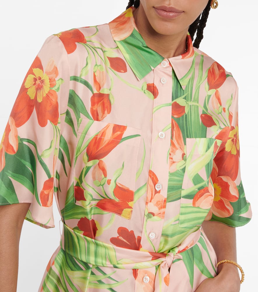 Closure: self-ties, buttoned front. Made in Italy. Pockets: patch pockets, breast pockets. Designer color name: Shell Pink Mult. Material: 100% silk. Care instructions: dry clean. Shop the latest Carolina Herrera Midi Dresses for women.
