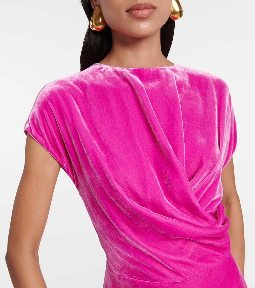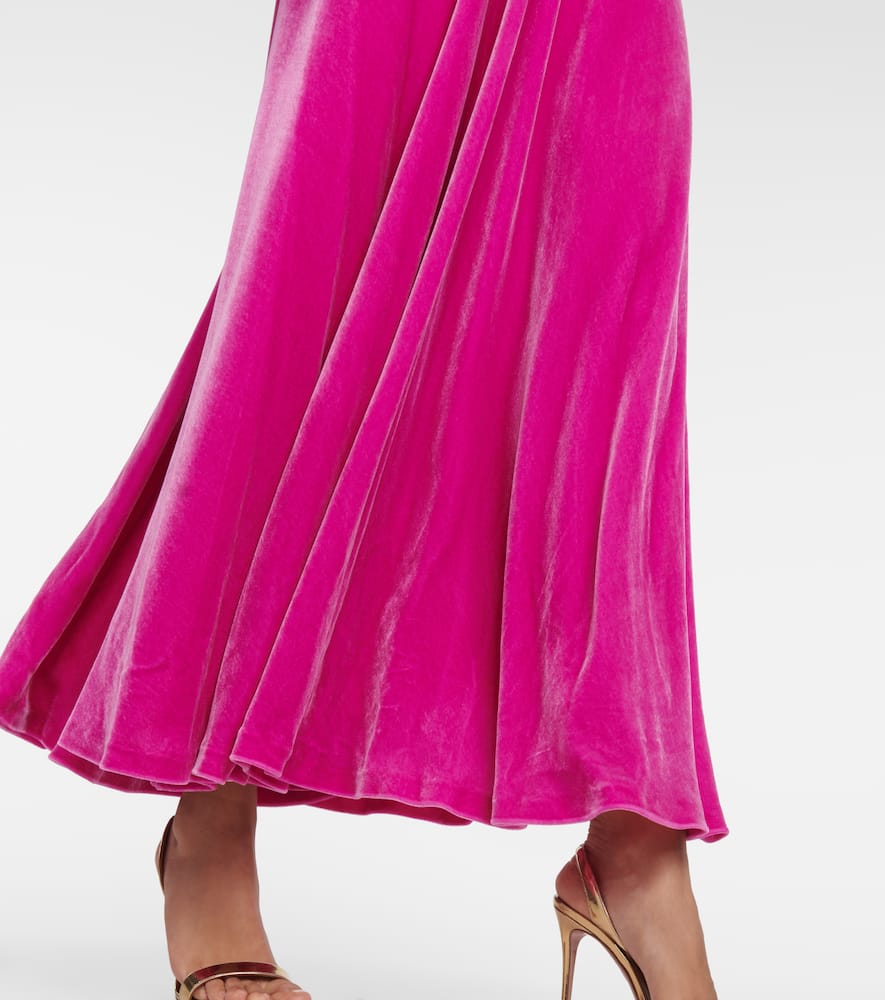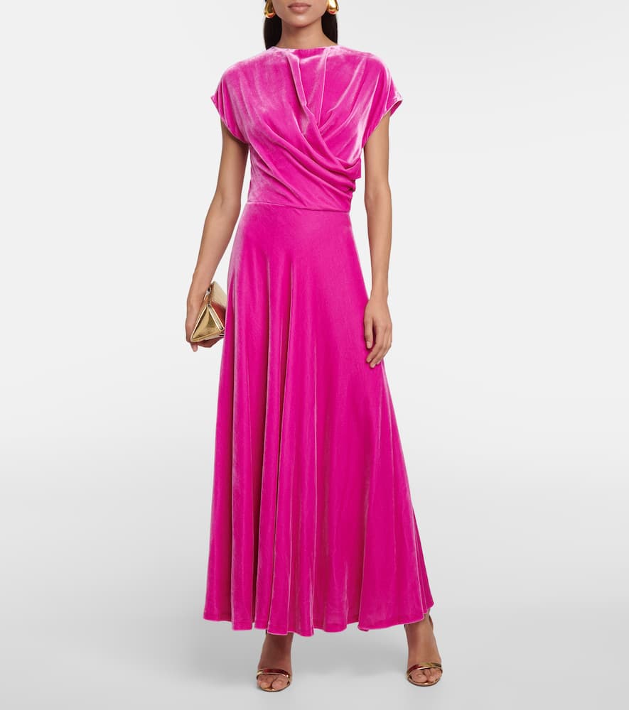 Material: 82% rayon, 18% silk. Care instructions: dry clean. Made in Greece. Designer color name: Fusion Pink. Lining: 100% polyester. Fully lined. Closure: concealed zipper, hook-fastening back. Shop the latest Costarellos Maxi Dresses for women.