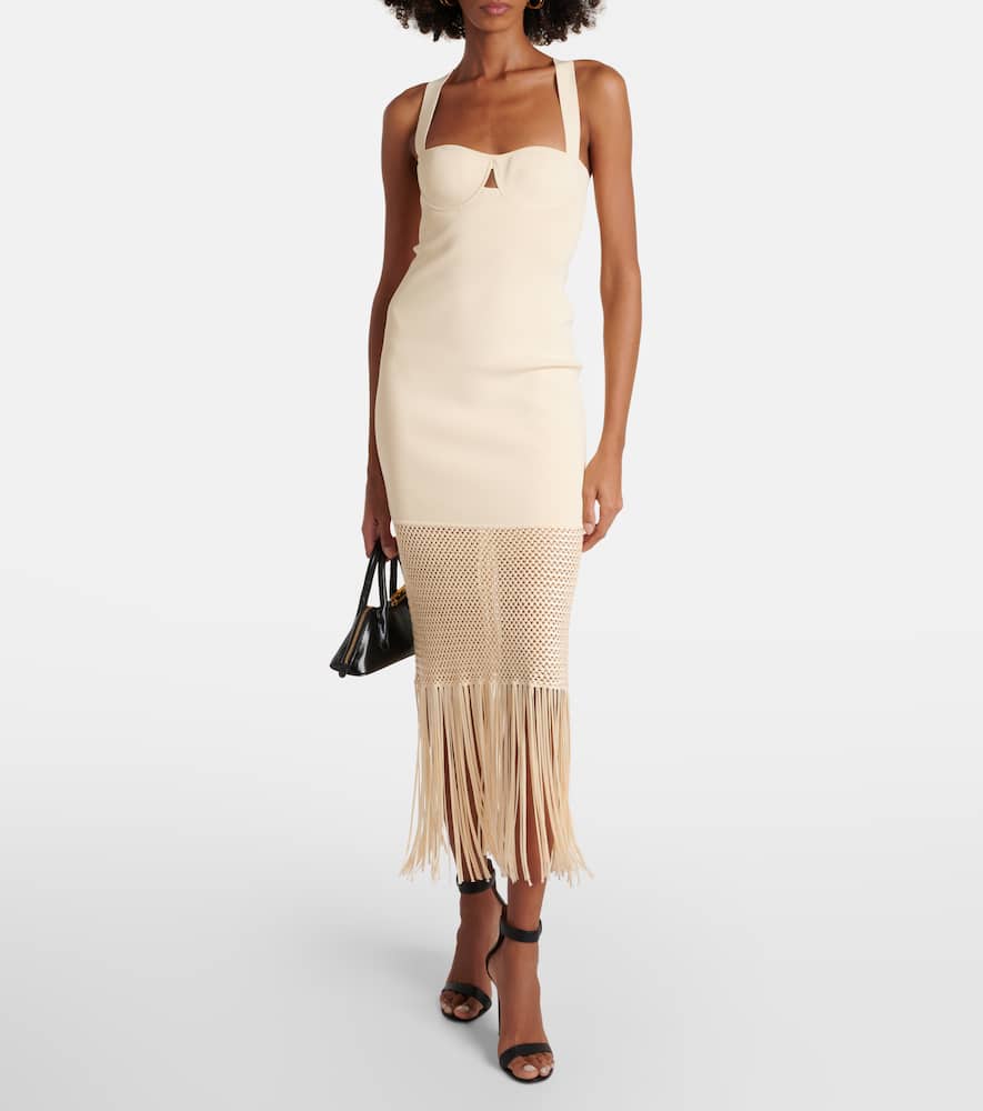 Material: 65% viscose, 21% polyamide, 13% polyester, 11% polyurethane. Care instructions: specialist clean. Made in Italy. Designer color name: Creme. Trim: 100% acetate. Shop the latest Galvan Midi Dresses for women.