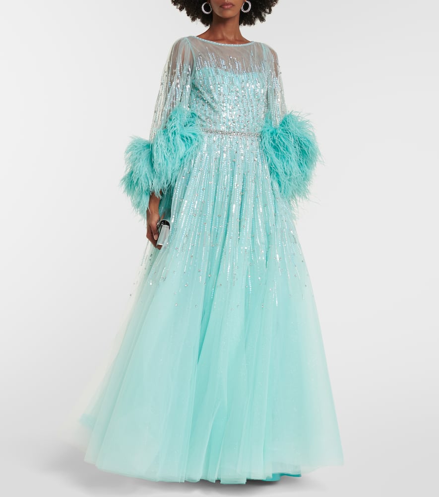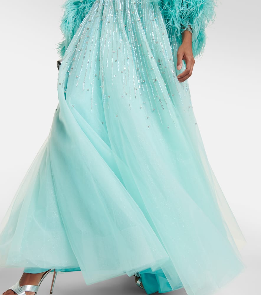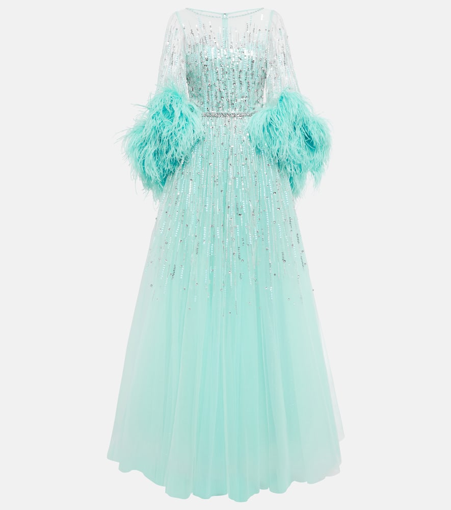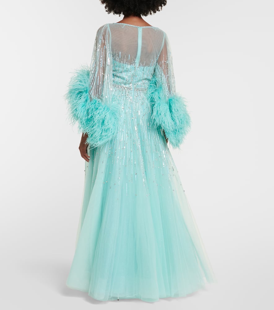 Jenny Packham Imani embellished faux-feather trimmed gown
