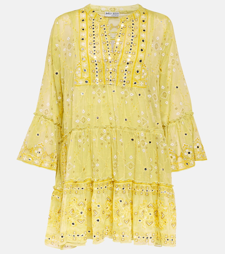 Material: 100% cotton. Care instructions: hand wash. Made in India. Designer color name: Ochre. Collar: V-neck. Separate lining slip: 100% cotton. Shop the latest Juliet Dunn Mini Dresses for women.