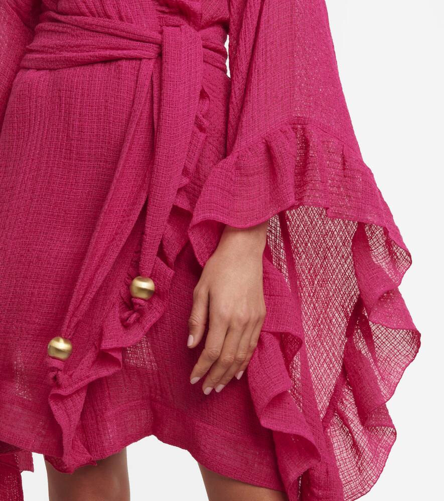 Closure: self-ties, open front. Made in the USA. Material: 90% linen, 10% polyamide. Designer color name: Fuschia. Detachable belt, Self-tie belt. Pockets: side slit pockets. Care instructions: dry clean. Shop the latest Lisa Marie Fernandez Mini Dresses for women.