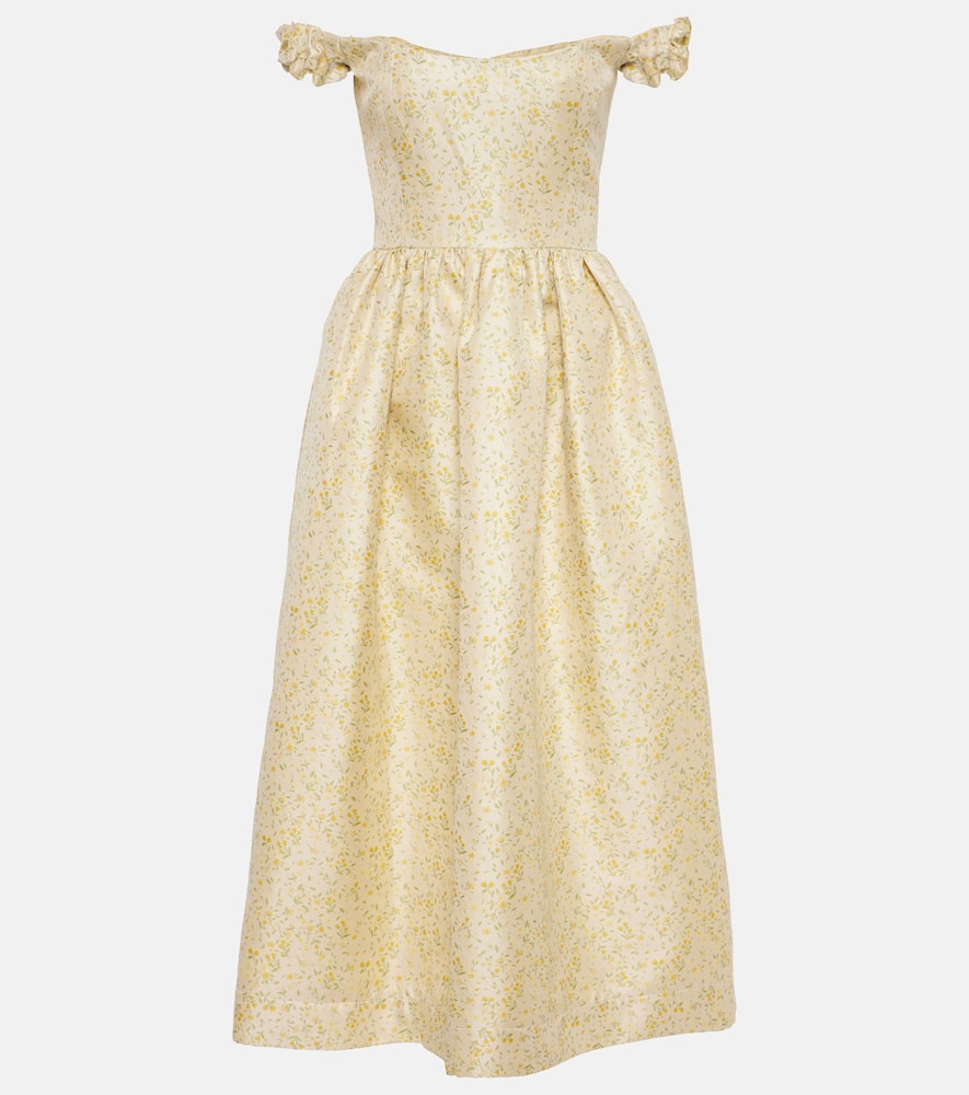 Material: 100% polyester. Care instructions: dry clean. Made in the USA. Designer color name: Yellow Daisy Brocade. Lining: 100% silk. Closure: zipped back. Shop the latest Markarian Midi Dresses for women.