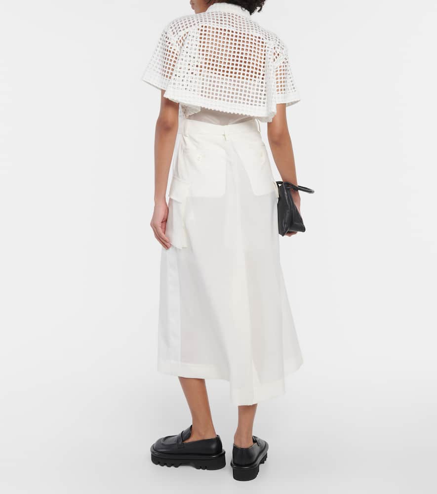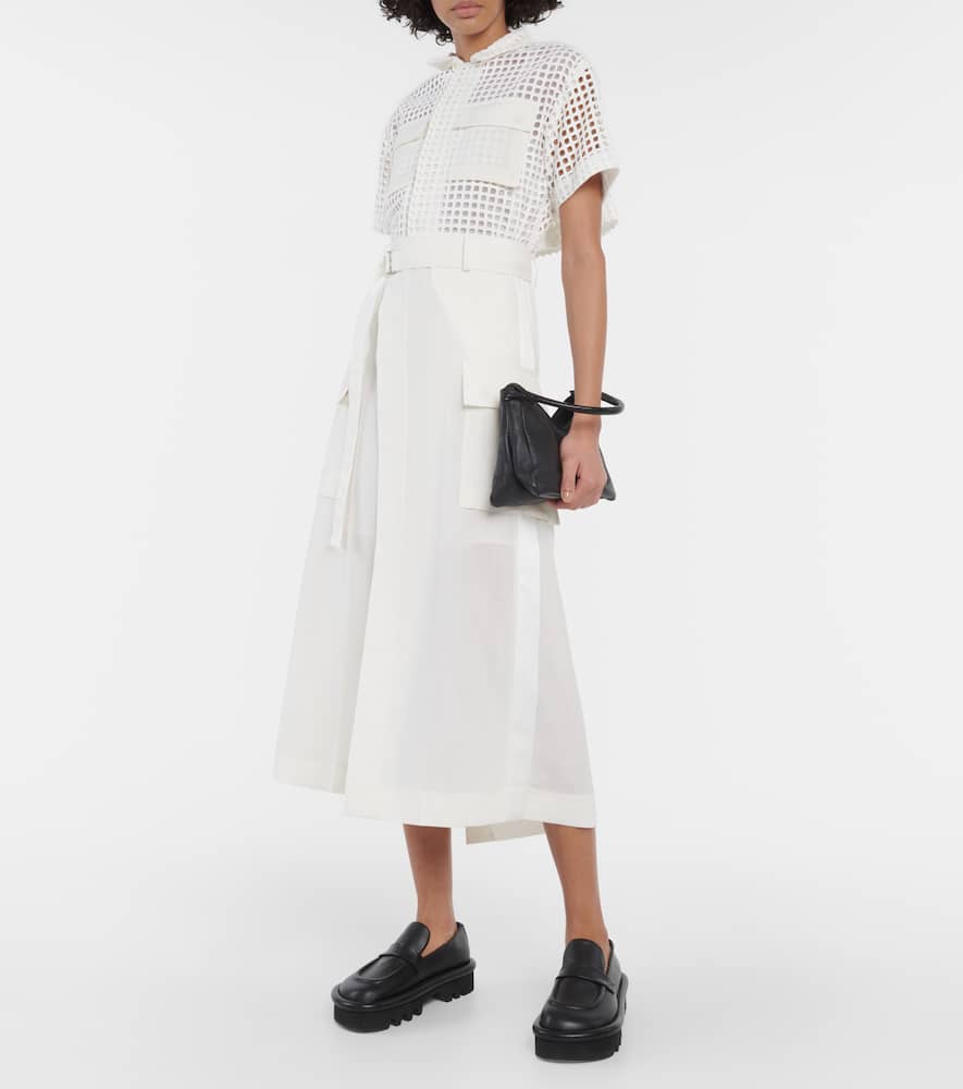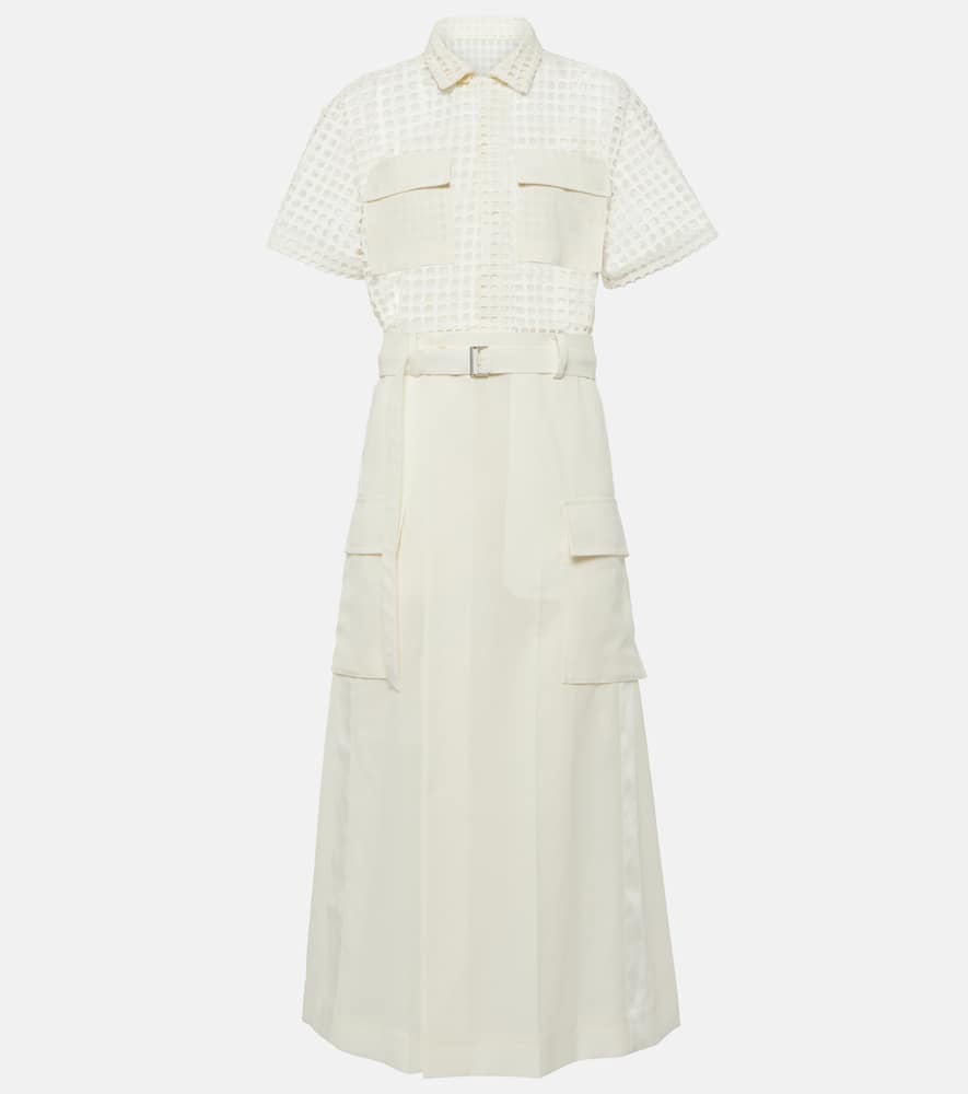 Material: 100% cotton. Care instructions: dry clean. Made in Japan. Designer color name: Off White. Material II: 100% polyester. Material III: 70% polyester, 30% wool. Lining: 100% polyester. Closure: partially buttoned front. Pockets: side slit pockets, back pockets, flap pockets. Attached belt. Shop the latest Sacai Midi Dresses for women.