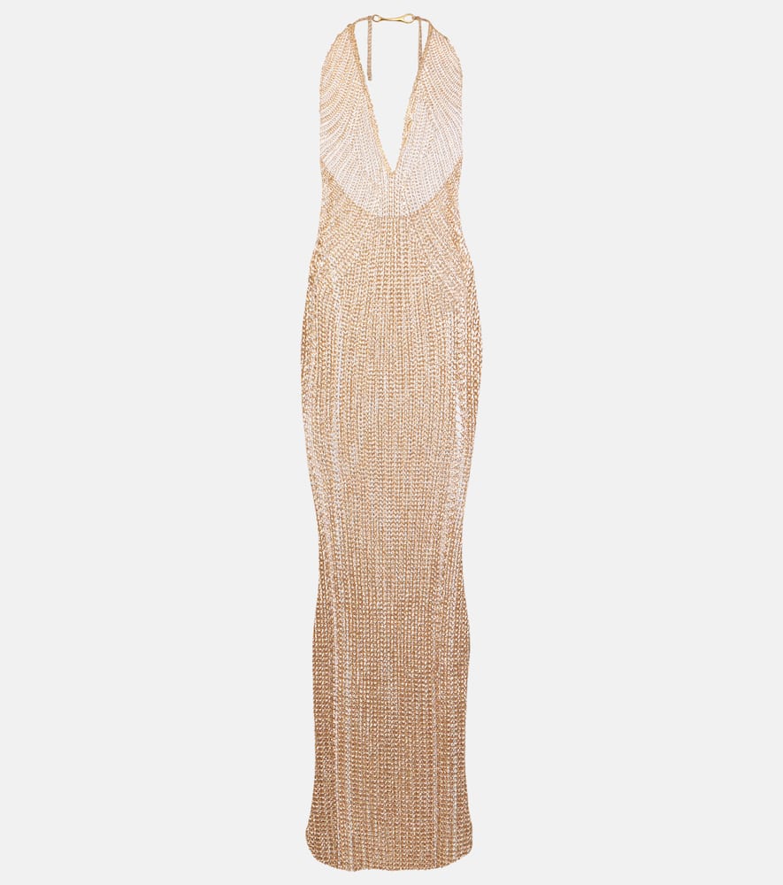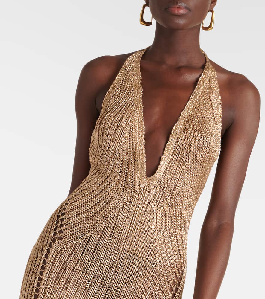 Material: 73% viscose, 14% metallic fibres, 13% polyamide. Care instructions: specialist clean. Made in Italy. Designer color name: Pale Gold. Closure: self-ties. Shop the latest Tom Ford Maxi Dresses for women.