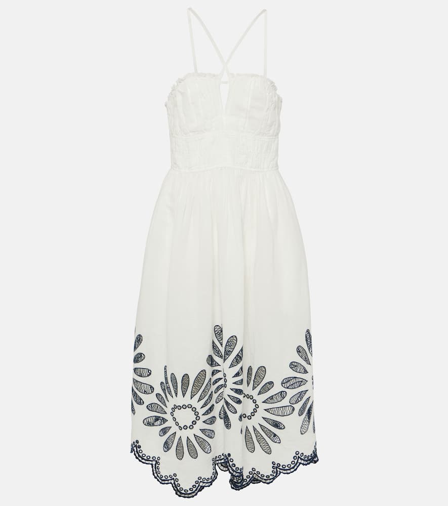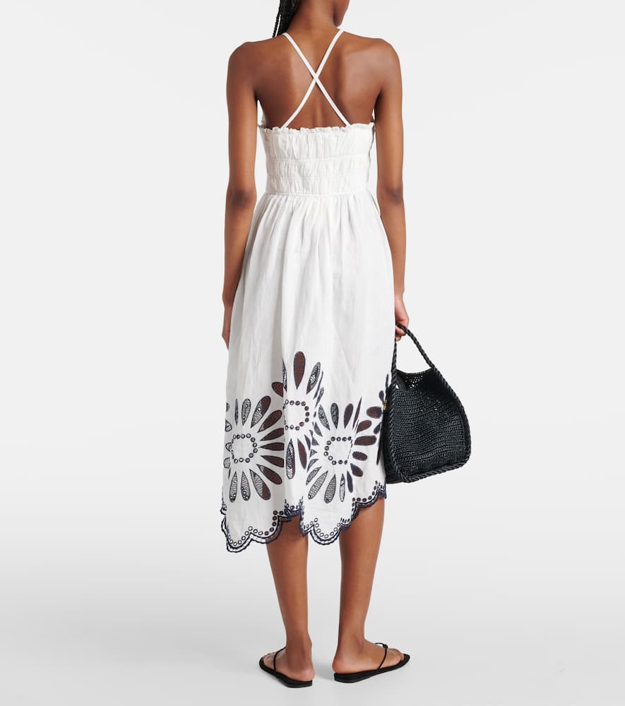 Material: 52% linen, 48% cotton. Care instructions: hand wash. Made in India. Designer color name: Porcelain. Closure: invisible zipper, hook fastening. Pockets: side slit pockets. Lining: 100% cotton. Shop the latest Ulla Johnson Midi Dresses for women.