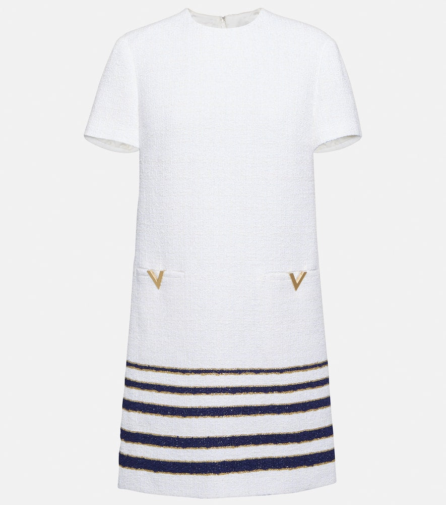 Made in Italy. Material: 1% metallic fibres, 47% viscose, 43% cotton, 9% polyamide. Closure: invisible zipper. Designer color name: Avorio/Navy/Gold. Lining: fully lined, 100% cupro. Care instructions: dry clean. Shop the latest Valentino Mini Dresses for women.