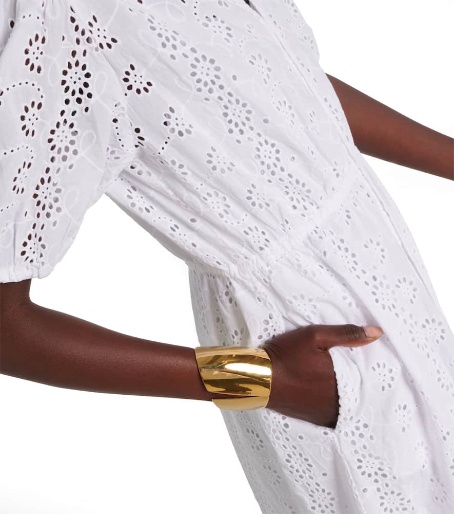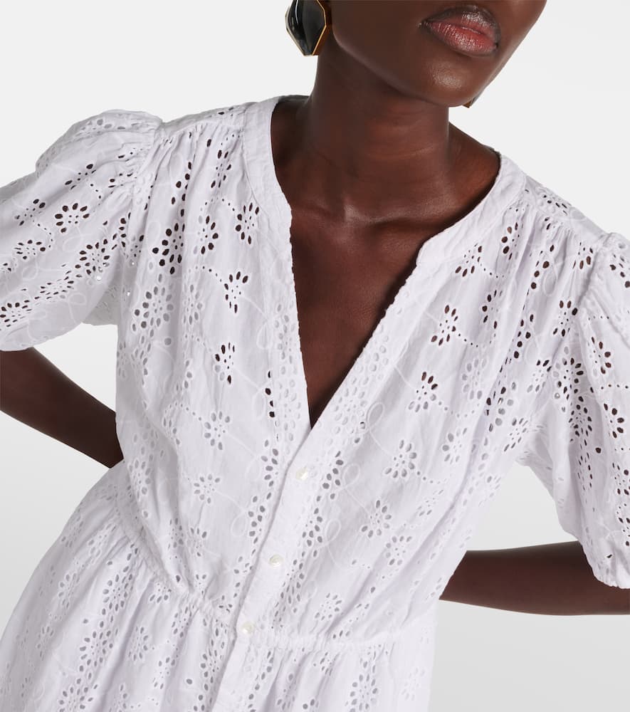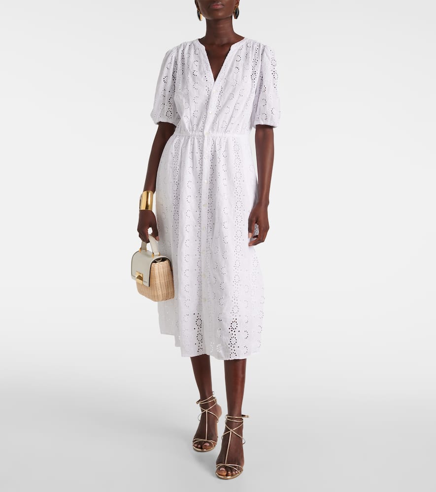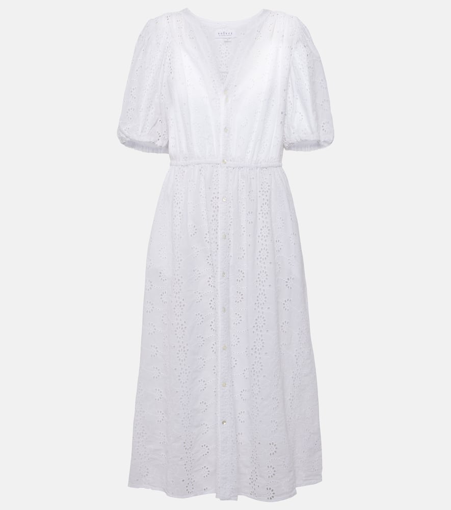 Material: 100% cotton. Care instructions: machine wash cold. Made in the USA. Designer color name: White. Closure: buttoned front. Elasticated waistband. Pockets: side slit pockets. Shop the latest Velvet Midi Dresses for women.