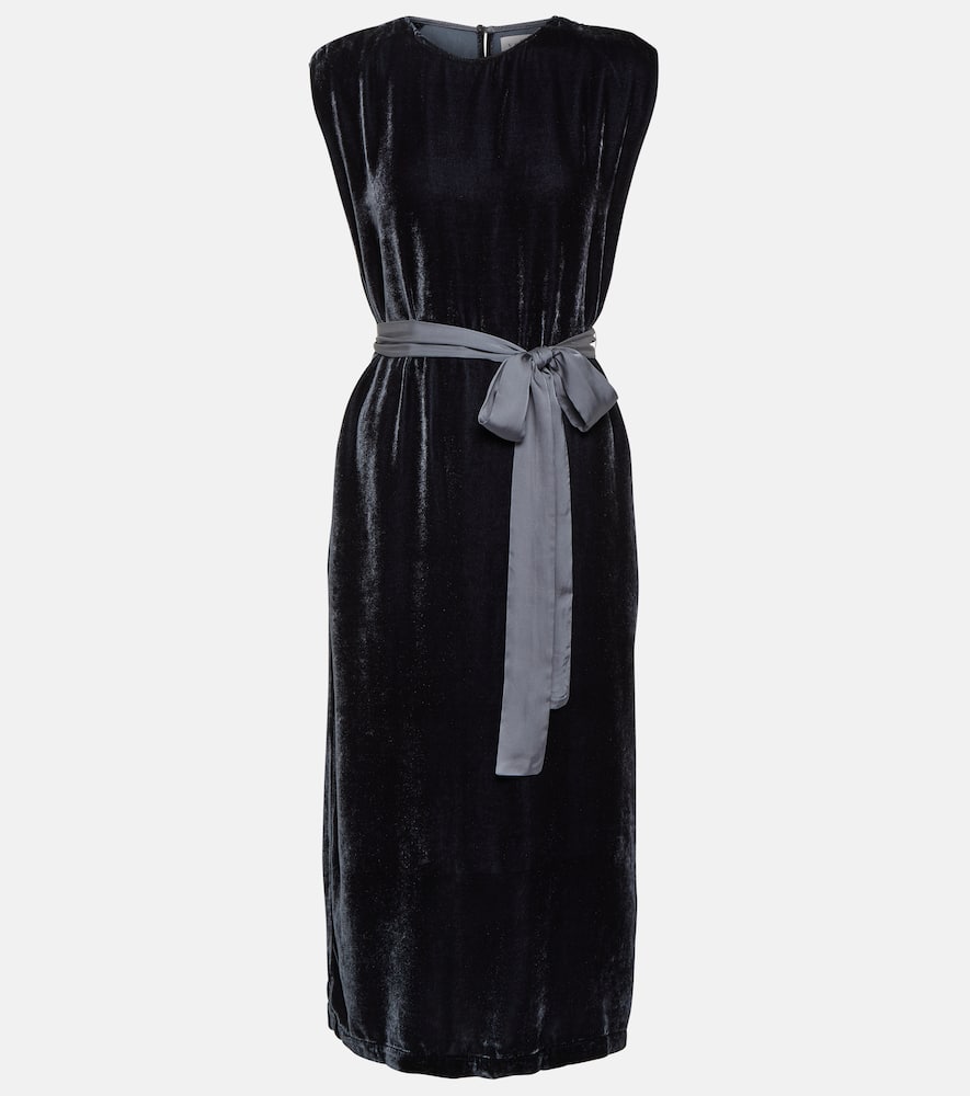 Material: 82% viscose, 18% silk. Care instructions: machine wash cold. Made in the USA. Designer color name: Navy. Closure: belted waist, button fastening. Material II: 100% viscose. Shop the latest Velvet Midi Dresses for women.