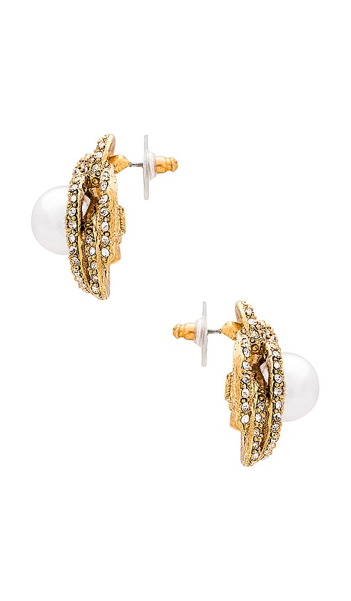 Jennifer Behr Loren Earrings in Metallic Gold. Jennifer Behr Loren Earrings in Metallic Gold. Gold-tone plated metal with rhinestone embellishments and faux pearl charm. Made in USA. Post back closure. Measures approx 1 in diameter. JEHR-WL248. 50RA82-crystal-antique-gold. Fascinated by the rich and powerful history of headpieces, which are signifiers of royalty and ceremony, Jennifer Behr is inspired by the talismanic power of a good headpiece, bringing you the most luxurious pieces on the market today. Each season, Jennifer artfully incorporates a range of materials such as sparkling Swarovski crystals with intricate metalwork, creating unique heirloom-quality designs, carefully constructed by hand in New York City. Shop the latest in fashion from Jennifer Behr