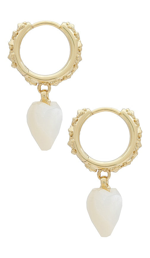 Kendra Scott Penny Heart Huggie Earrings in Ivory. Kendra Scott Penny Heart Huggie Earrings in Ivory. 14k gold-plated brass with Mother of Pearl heart charms. Made in China. Hinge closure. Measures approx 1 dangling. KEST-WL531. 9608856852. Kendra Scott began her jewelry line in Austin, Texas in 2002 with $500 and an eye for design. Today, the natural stones and custom-shaped pieces intrinsic to the brand have attracted fans from all over the globe. Along with creating timeless jewelry that is loved by many, they focus their energy and success on family, fashion, and philanthropy. Shop the latest in fashion from Kendra Scott