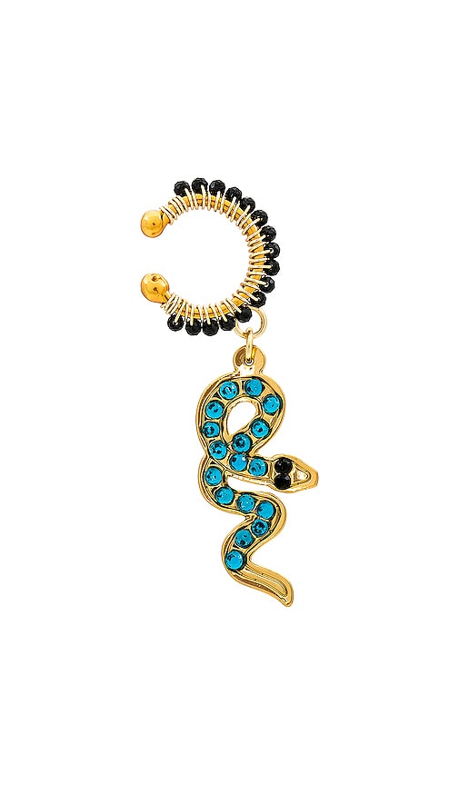 Mercedes Salazar Eirene Earcuff in Teal. Mercedes Salazar Eirene Earcuff in Teal. Embellished gold-tone cuff with dangling snake. Made in Colombia. Tin jewelry holder included. Sold as a single earring. Measures approx .5 in diameter Measures approx 1.25 dangling. MRCZ-WL159. MAGIA84. Designs that tell stories, with materials only in your wildest dreams, Mercedes Salazar. Started as a two-person company, this jewelry brand quickly became popular in Colombia and today reaches to the far corners of the globe. The brand always embraces color usage and various textured materials. Shop the latest in fashion from Mercedes Salazar