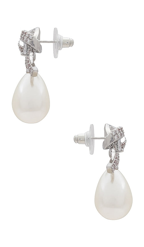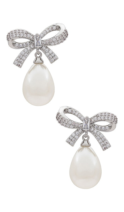 SHASHI Pave Bow Pearl Drop Earring in Metallic Silver