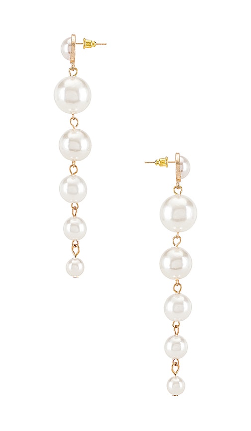 SHASHI Pearl Drop Earrings in Metallic Gold. SHASHI Pearl Drop Earrings in Metallic Gold. Gold tone metal and acrylic pearls. Imported. Post back closure. Measures approx 3.75 dangling. SHAS-WL386. SH-E430. SHASHI | Easy to wear elegance. A New York based brand established in 2009. A household name for classic, modern, affordable luxury. SHASHI offers fun, flirty and feminine pieces for all women across the world. Each jewelry piece reflects genuine craftsmanship and true originality. Shop the latest in fashion from SHASHI