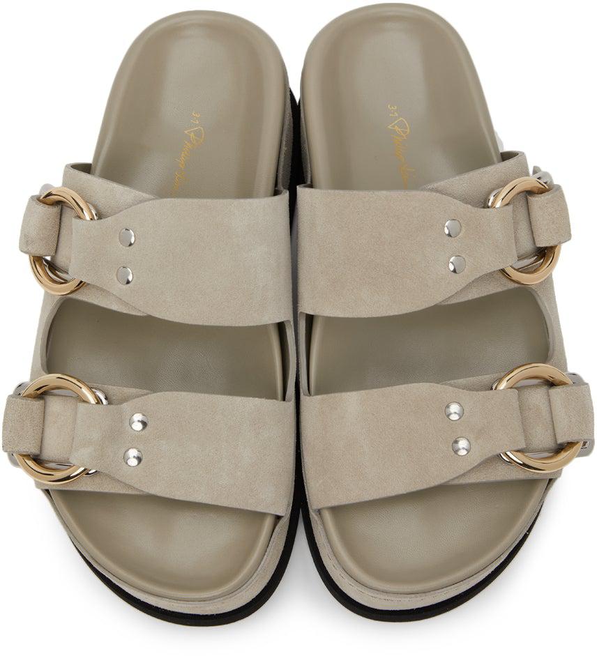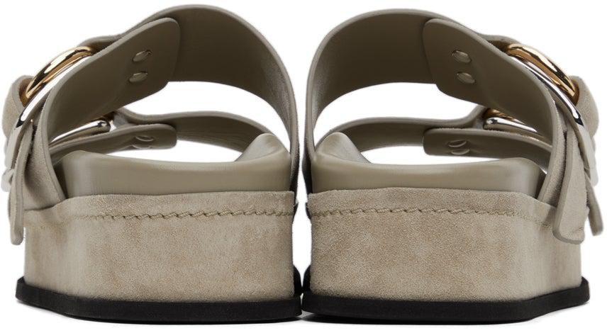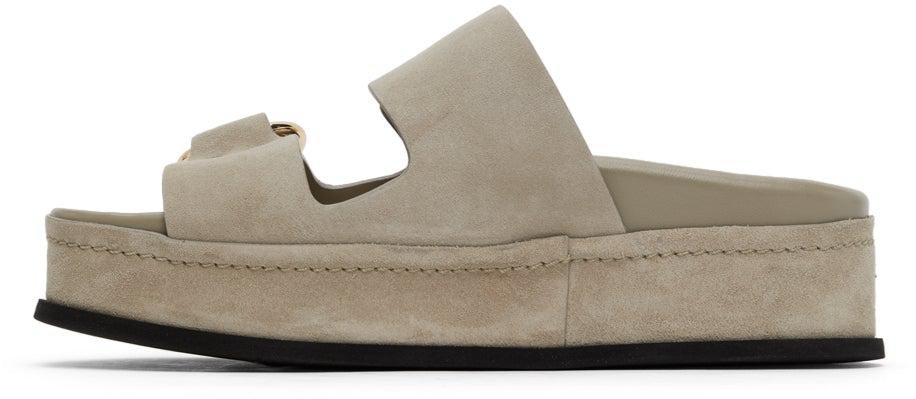 Calfskin suede platform sandals in beige. Open round toe. Adjustable cinch straps at vamp. Gold-tone logo stamp at molded leather footbed. Covered leather platform midsole. Foam rubber outsole in black. Pale gold-tone and silver-tone hardware. Approx. 1.5 platform. Supplier color: Cream Upper: calfskin. Sole: rubber. Brand: 3.1 Phillip Lim