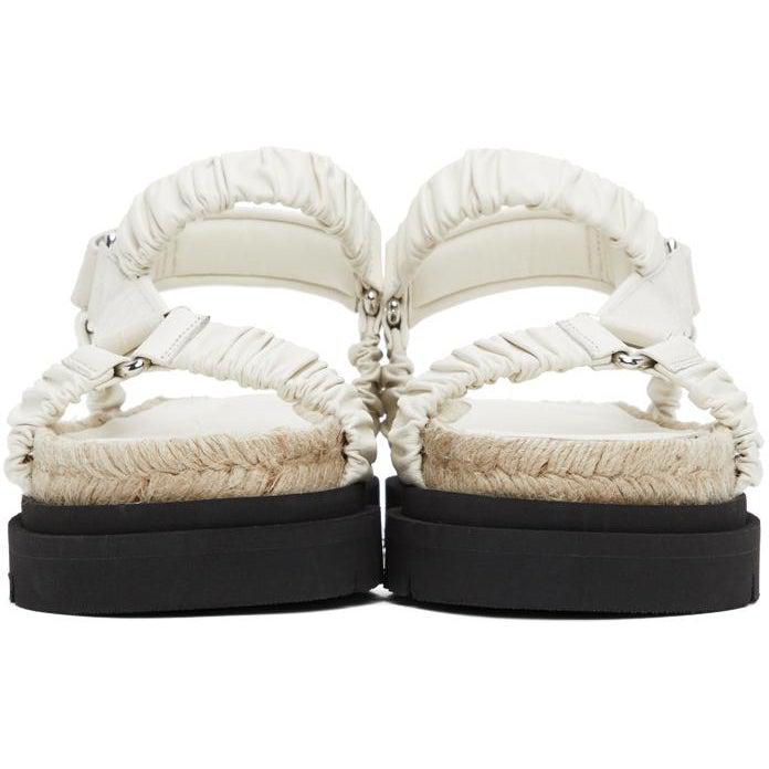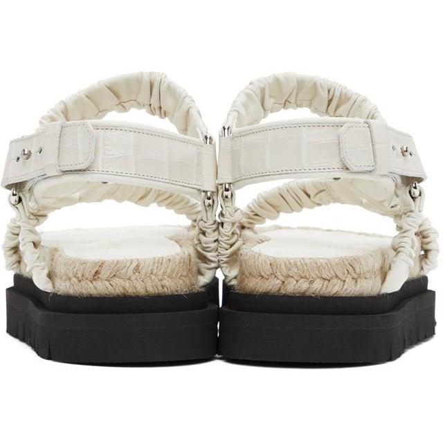 Grained leather sandals in off-white. Open-round toe. Adjustable croc-embossed ankle strap with post-stud fastening. Gold-tone logo stamp at molded leather footbed. Braided jute midsole in beige. Treaded rubber platform sole in black. Approx. 2 platform. Supplier color: Creme brule Upper: leather. Sole: rubber. Brand: 3.1 Phillip Lim