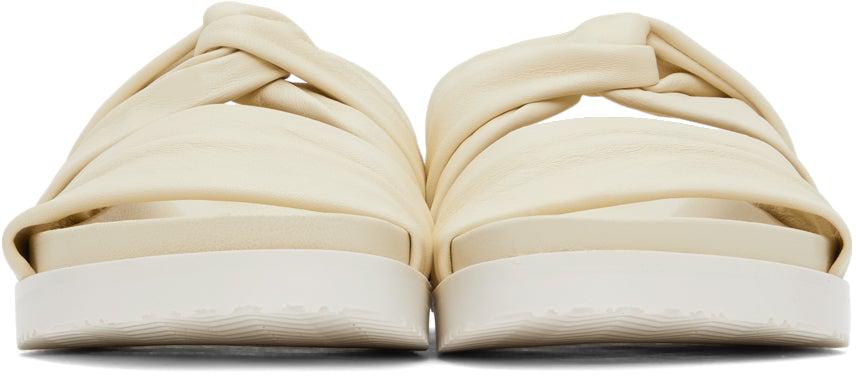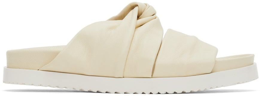 Buffed calfskin slip-on flat sandals in off-white. Open round toe. Twisted construction at vamp. Logo stamp in gold-tone at molded leather footbed. Rubber midsole in white. Treaded rubber outsole in white. Supplier color: Vanilla Upper: calfskin. Sole: rubber. Brand: 3.1 Phillip Lim