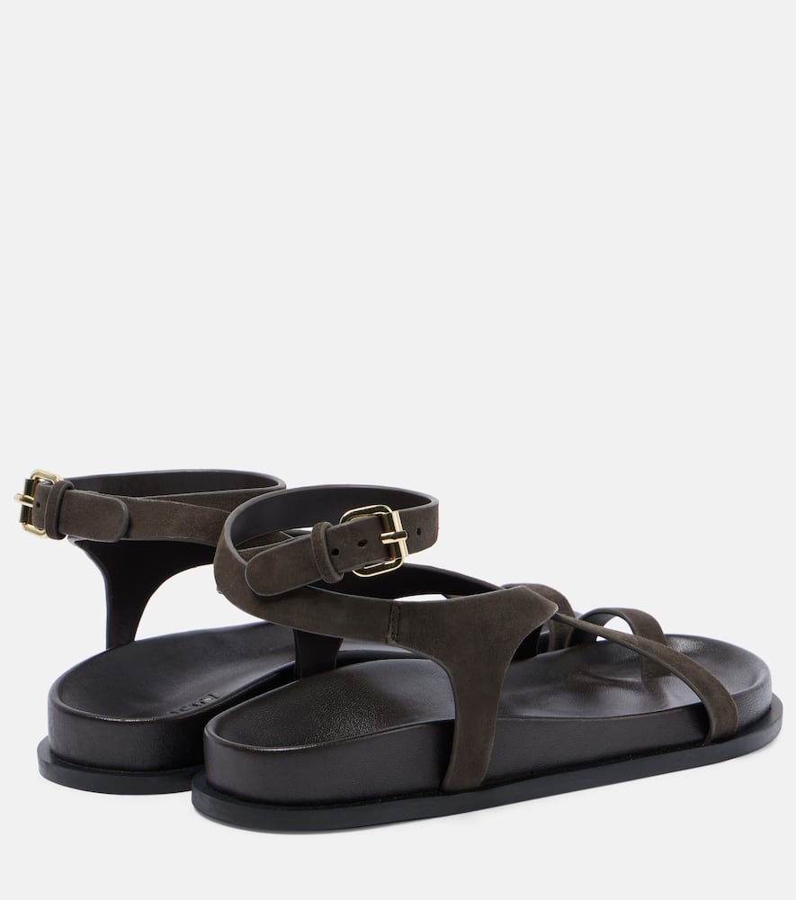 Upper: suede. Lining: leather. Sole: leather insole, rubber sole. Toe shape: round open toe. Made in India. Includes: dust bags, shoe box. Designer color name: Mulch Suede. Shop the latest A.Emery Flat Sandals for women now.