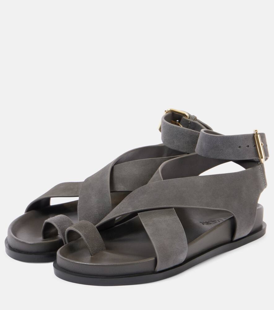 Upper: leather. Lining: leather. Sole: leather insole, rubber sole. Toe shape: round open toe. Made in India. Includes: dust bags, shoe box. Designer color name: Storm Suede. Closure: buckle-fastening ankle strap. Shop the latest A.Emery Flat Sandals for women now.