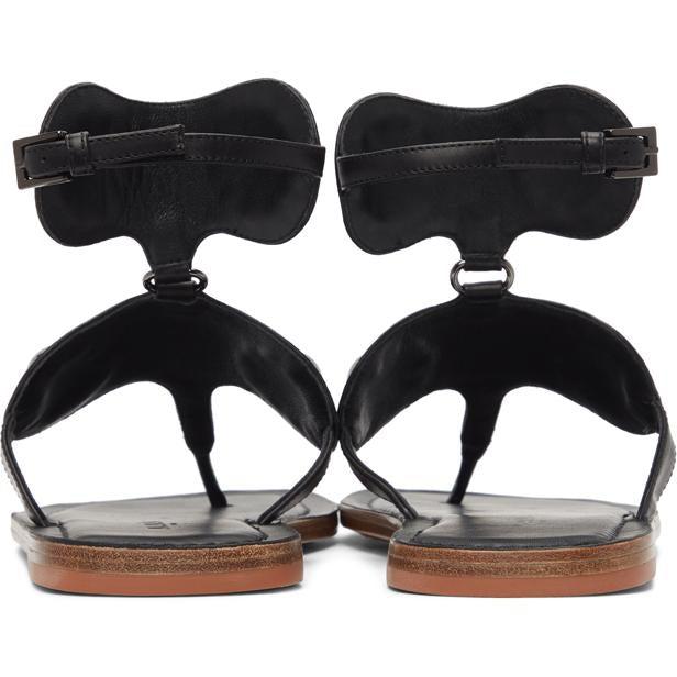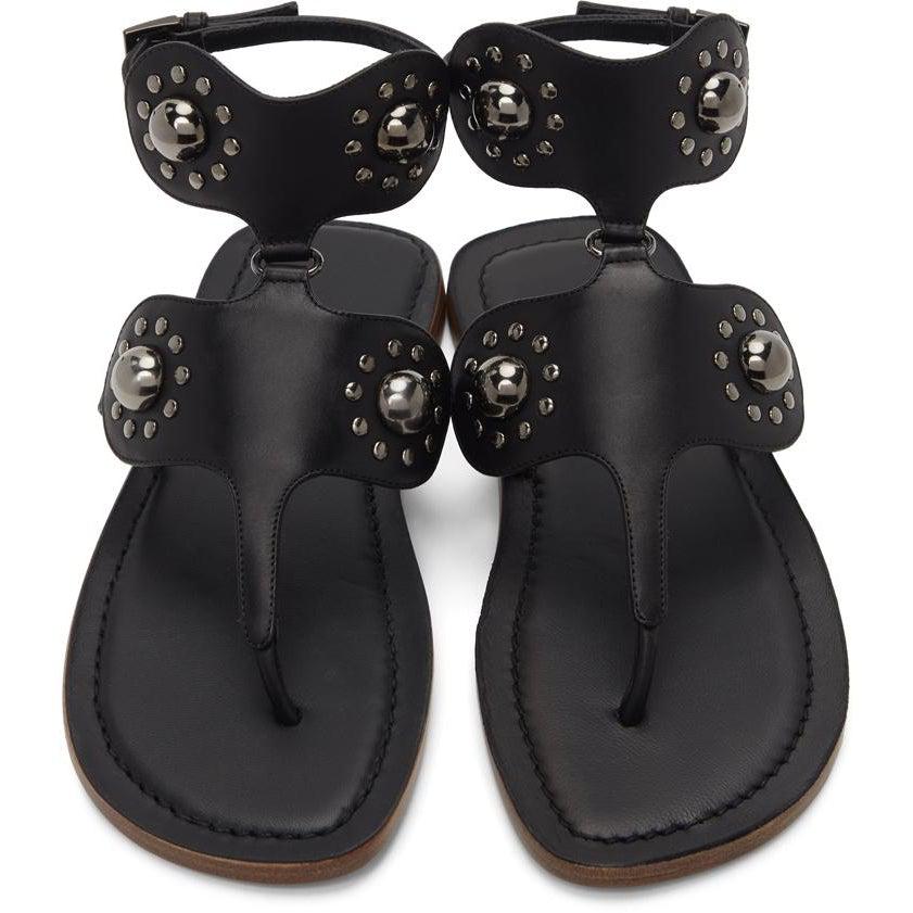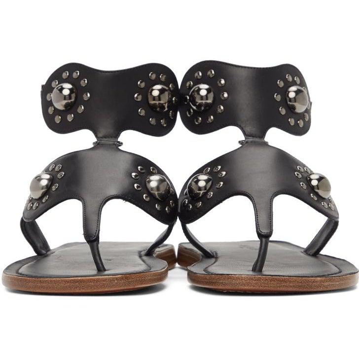 Buffed calfskin sandals in black. Studs throughout. Open round toe. Adjustable ankle strap with pin-buckle fastening. Stacked leather midsole in brown. Leather outsole in tan. Gunmetal-tone hardware. Part of the Alaïa Edition 2007 collection. Supplier color: Black Upper: calfskin. Sole: calfskin, rubber. Brand: ALAÃA