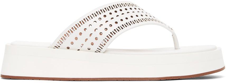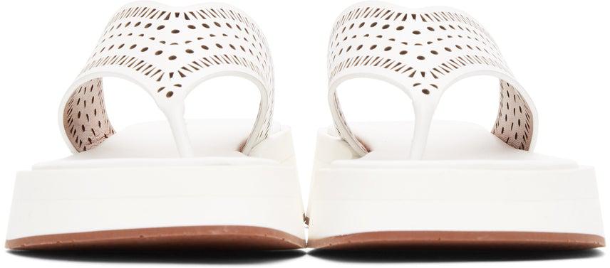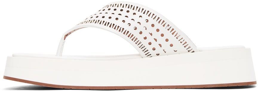 Buffed calfskin flat sandals in white featuring signature perforated detailing throughout. Round toe. Thong-style strap at vamp. Logo-embossed at buffed calfskin footbed. Grained lambskin lining in beige. Tonal foam rubber platform midsole. Beige leather outsole with rubber injection. Treaded brown rubber and faux-leather outsole. Approx. 1.5 platform. Supplier color: White Upper: calfskin. Sole: rubber. Brand: ALAÃA
