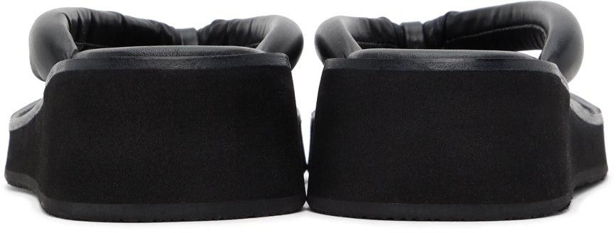 Buffed leather slip-on sandals in black. Open square toe. Tonal rolled thong-style strap at vamp. Logo embossed at buffed leather footbed. Tonal foam rubber midsole featuring style number embossed at inner side. Tonal treaded rubber outsole. Approx. 0.75 platform; 1.75 heel. Supplier color: Black Upper: leather. Sole: rubber. Brand: AMOMENTO