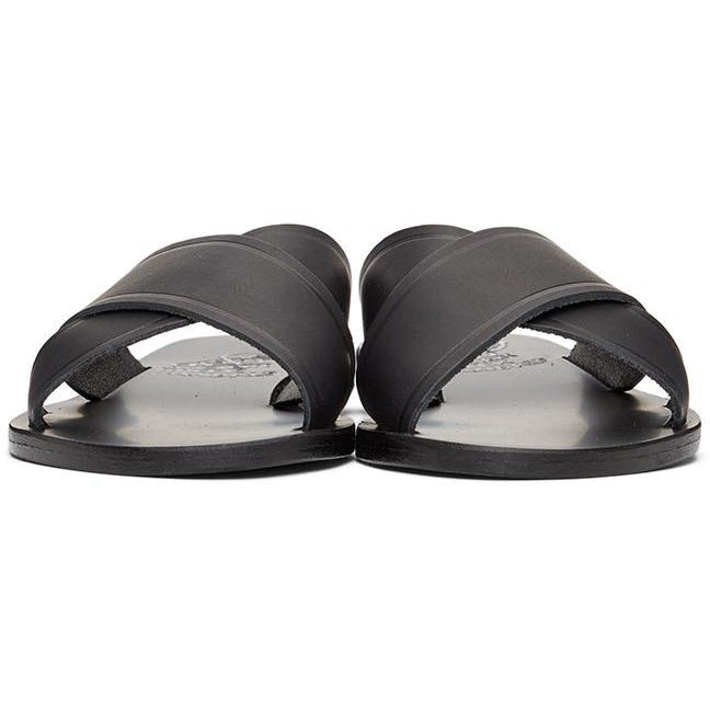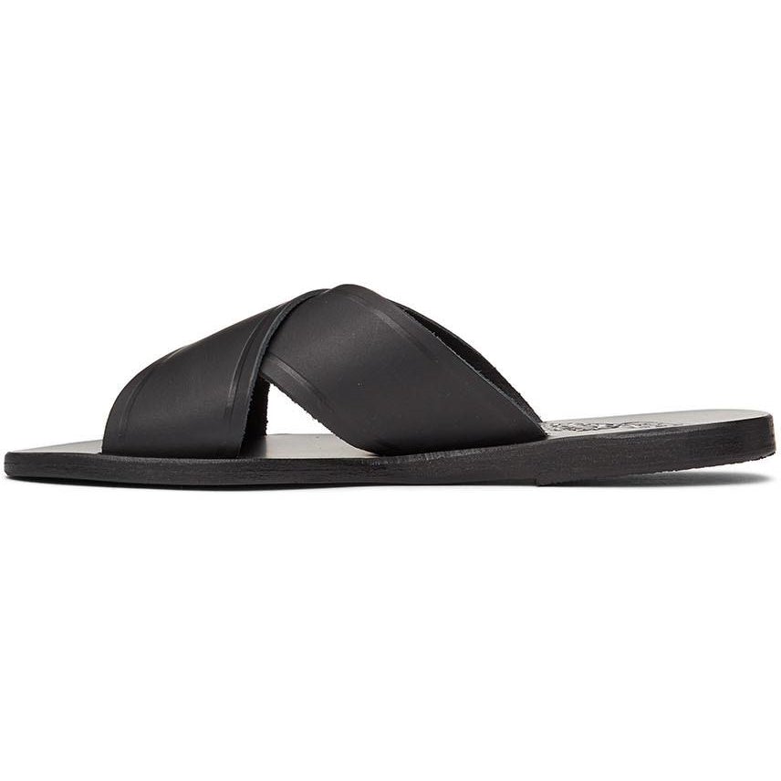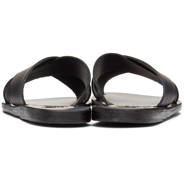 Handcrafted vachetta leather slip-on sandals in black. Open round toe. Criss-crossing straps at vamp. Logo embossed at tonal leather footbed. Tonal leather sole with rubber injection at heel. Supplier color: Black Upper: leather. Sole: leather, rubber. Brand: Ancient Greek Sandals