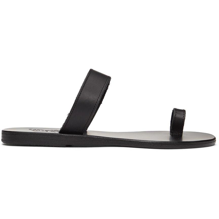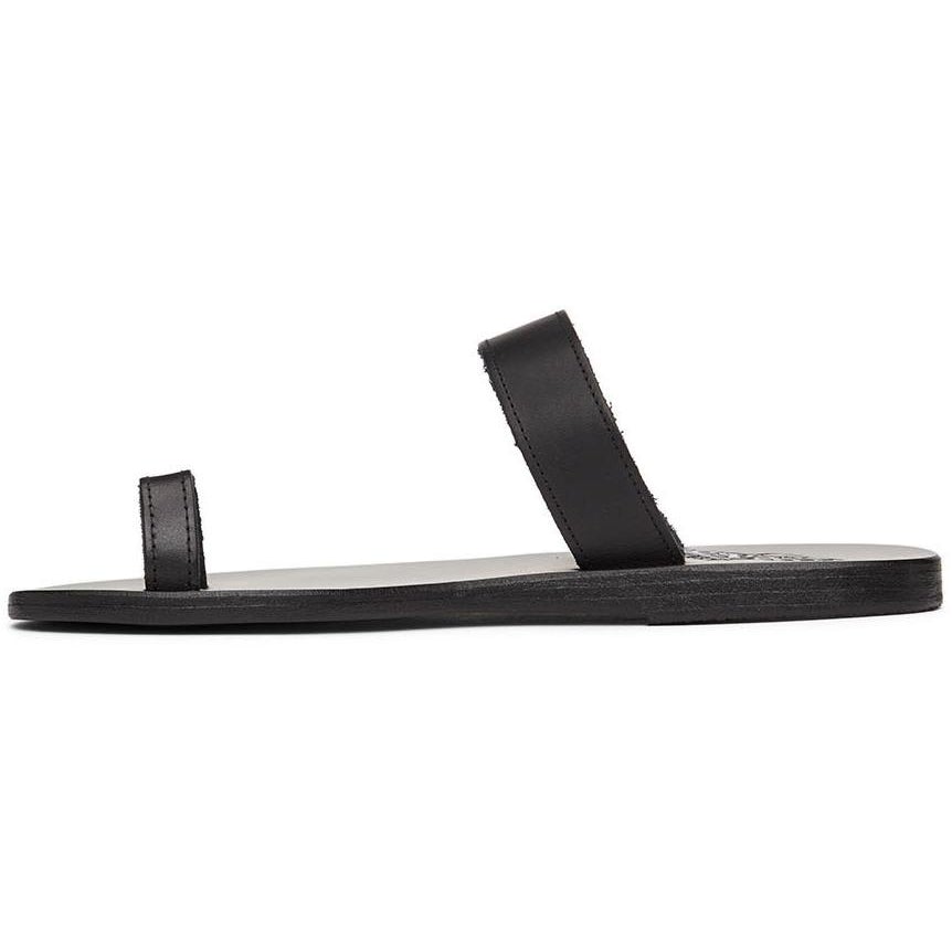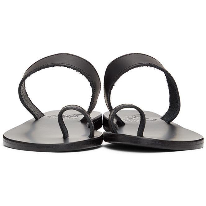 Handcrafted vachetta leather slip-on sandals in black. Single toe strap at open round toe. Strap at vamp. Logo embossed at tonal leather footbed. Tonal leather sole with rubber injection at heel. Supplier color: Black Upper: leather. Sole: leather, rubber. Brand: Ancient Greek Sandals
