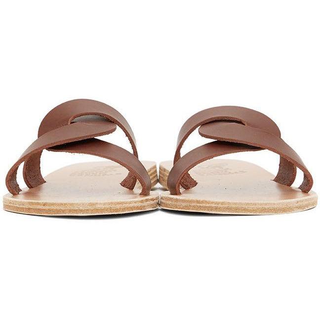 Handcrafted vachetta leather slip-on sandals in brown. Open round toe. Interlocking straps at vamp. Logo embossed at tan leather footbed. Leather sole in tan with rubber injection at heel. Supplier color: Chestnut Upper: leather. Sole: leather, rubber. Brand: Ancient Greek Sandals