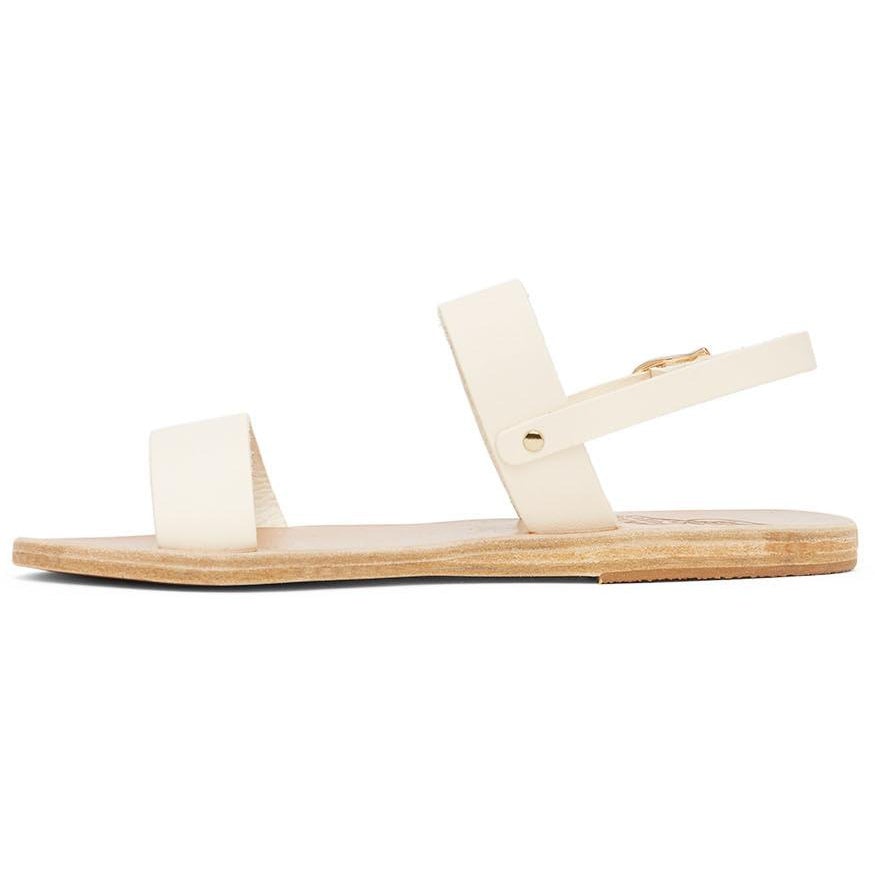 Handcrafted vachetta leather sandals in off-white. Open round toe. Strap at vamp. Adjustable ankle strap with signature pin-buckle fastening. Logo embossed at tan leather footbed. Leather sole in tan with rubber injection at heel. Gold-tone hardware. Supplier color: Off-white Upper: leather. Sole: leather, rubber. Brand: Ancient Greek Sandals