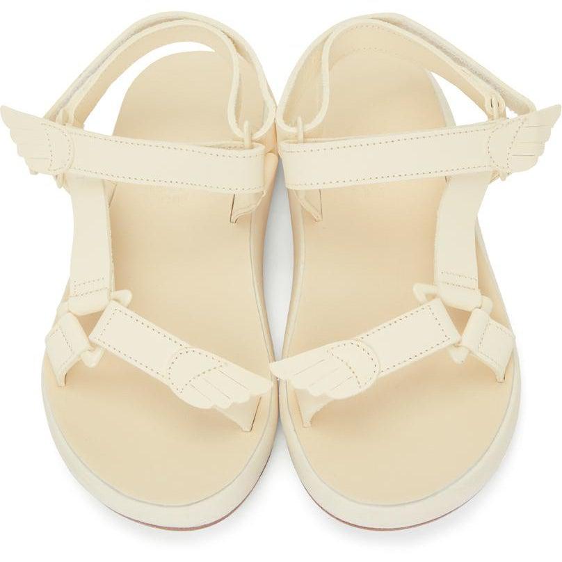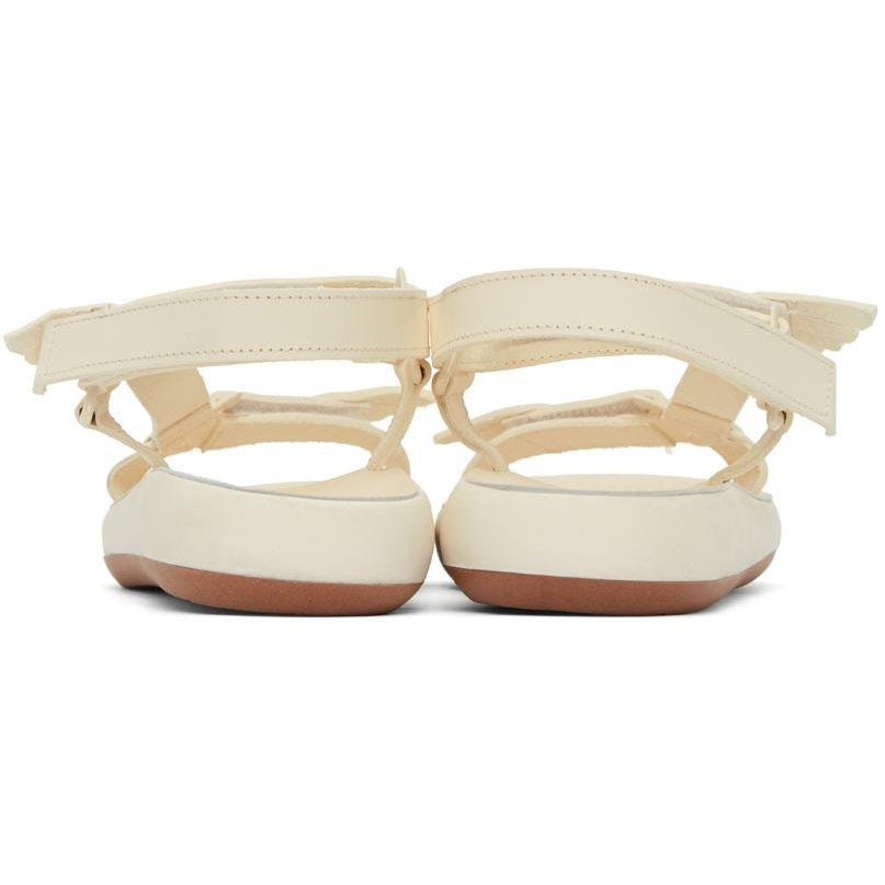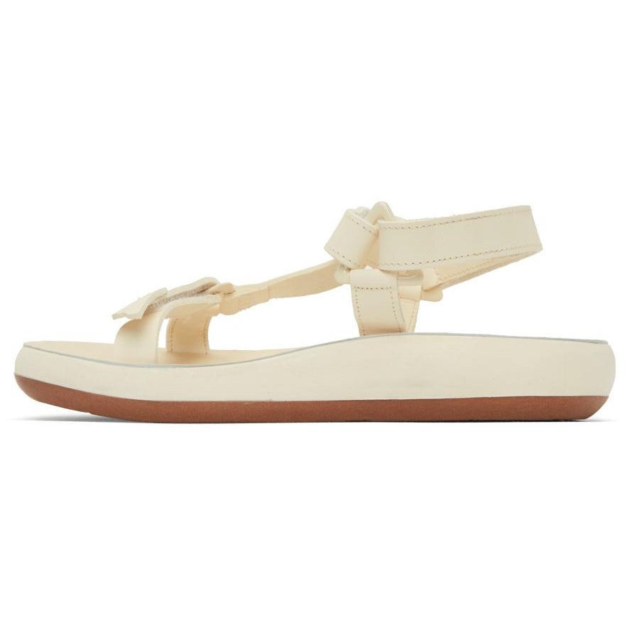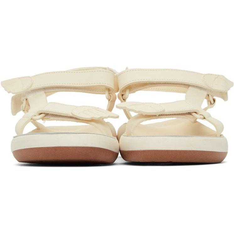 Chemical-free vachetta leather sandals in off-white. Open round toe. Adjustable Velcro fastening at vamp, ankle, and heel. Logo embossed at tonal leather footbed. Tonal rubber midsole. Treated rubber outsole in tan. Tonal hardware. Supplier color: Off-white Upper: leather. Sole: rubber. Brand: Ancient Greek Sandals