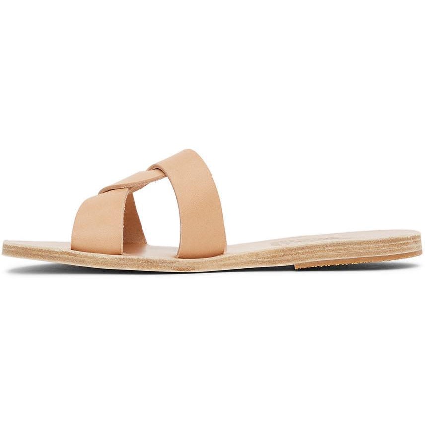Handcrafted vachetta leather slip-on sandals in tan. Open round toe. Interlocking straps at vamp. Logo embossed at tonal leather footbed. Tonal leather sole with rubber injection at heel. Supplier color: Natural Upper: leather. Sole: leather, rubber. Brand: Ancient Greek Sandals