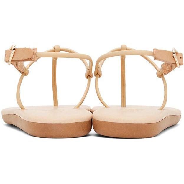 Handcrafted grained faux-leather sandals in tan. Open round toe. Adjustable ankle strap with signature pin-buckle fastening. Logo embossed at tonal faux-leather footbed. Tonal treaded rubber sole. Gold-tone hardware. Supplier color: Natural Upper: synthetic. Sole: rubber. Brand: Ancient Greek Sandals