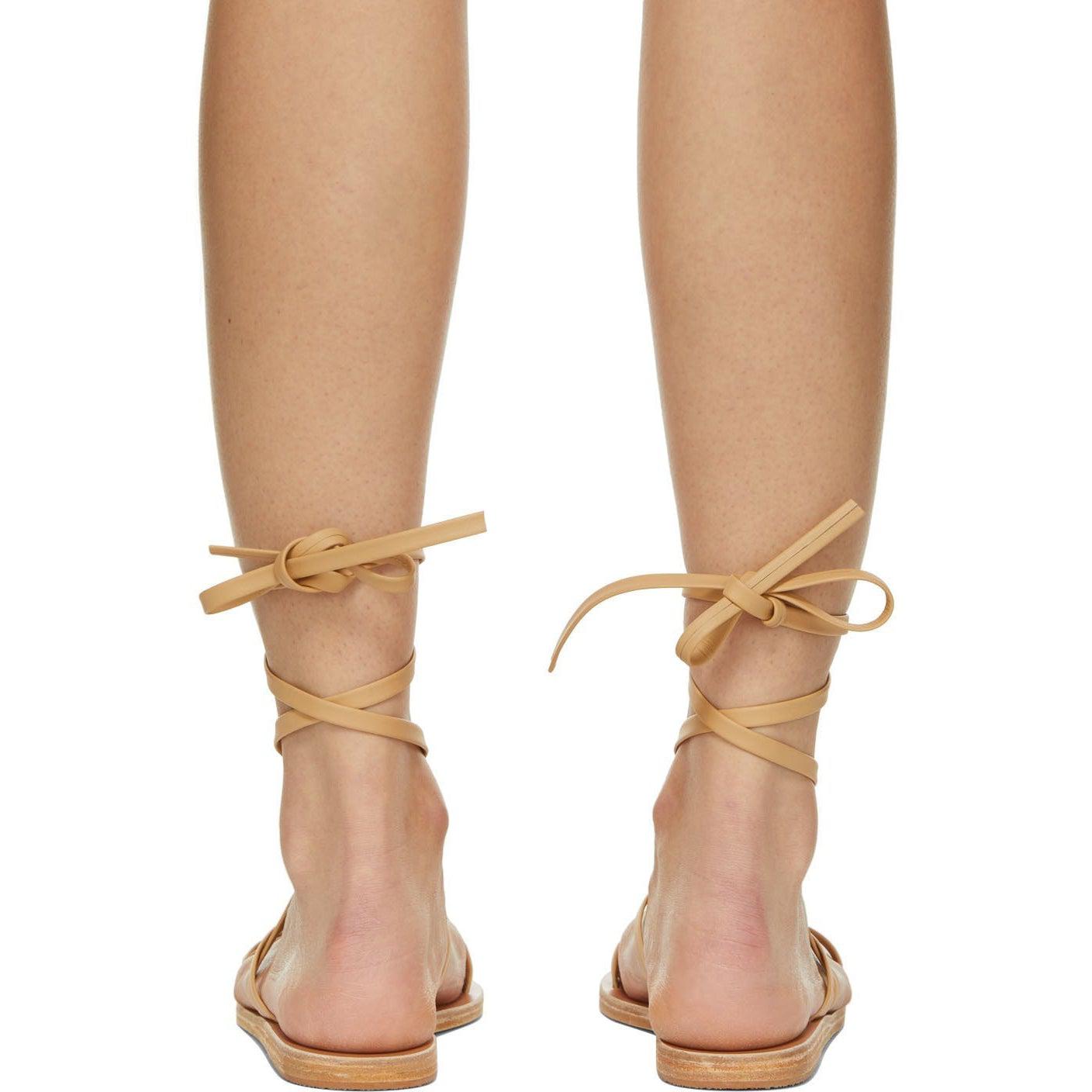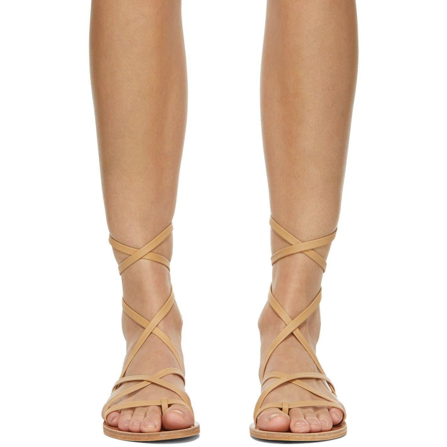 Handcrafted grained nappa leather sandals in tan. Open round toe. Crisscrossing straps at vamp. Wraparound ankle-strap with self-tie fastening. Logo embossed at tonal leather footbed. Tonal leather sole with rubber injection at heel. Supplier color: Natural Upper: leather. Sole: leather, rubber. Brand: Ancient Greek Sandals