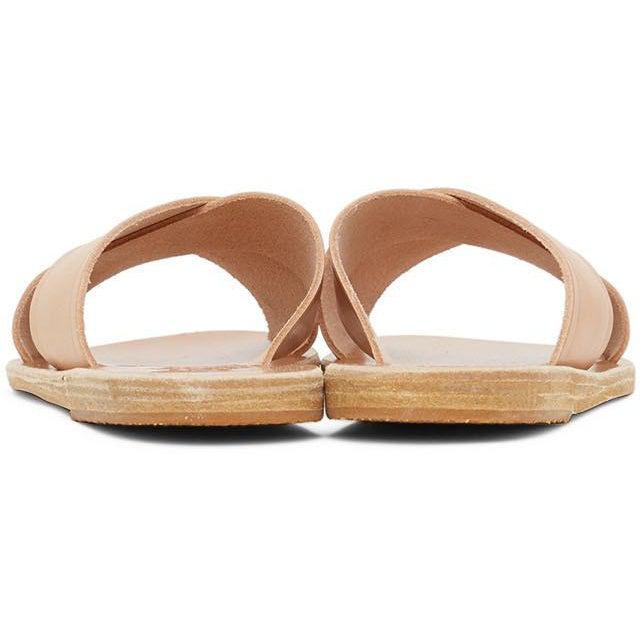 Handcrafted vachetta leather slip-on sandals in tan. Open round toe. Criss-crossing straps at vamp. Logo embossed at tonal leather footbed. Tonal leather sole with rubber injection at heel. Supplier color: Natural Upper: leather. Sole: leather, rubber. Brand: Ancient Greek Sandals