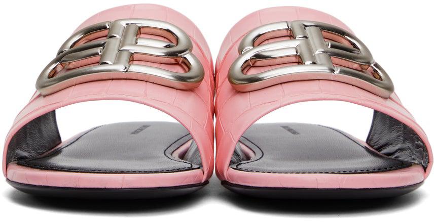 Croc-embossed calfskin slip-on sandals in pink. Open round toe. Logo hardware at vamp. Logo embossed at tonal leather footbed. Leather sole in black with rubber injection at heel. Silver-tone hardware. Supplier color: Light pink Calfskin. Brand: Balenciaga