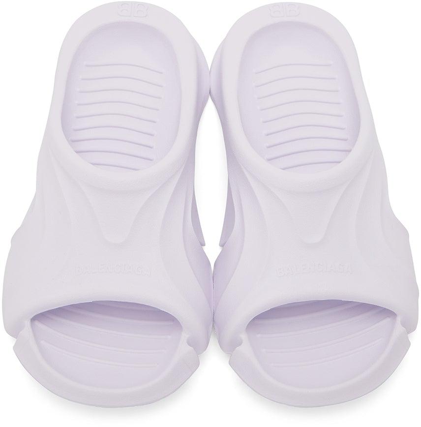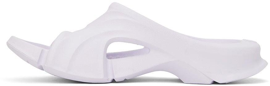 Rubber slip-on sandals in white. Open round toe. Logo embossed at vamp and heel. Cut-out at sides. Textured molded rubber footbed. Tonal treaded rubber outsole. Supplier color: White Rubber. Brand: Balenciaga