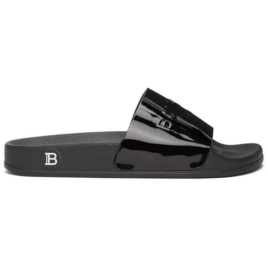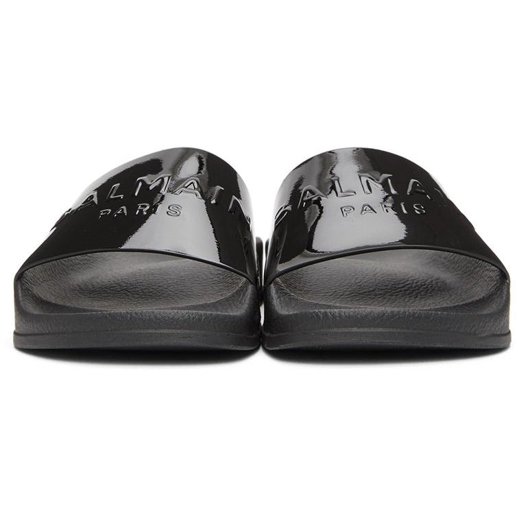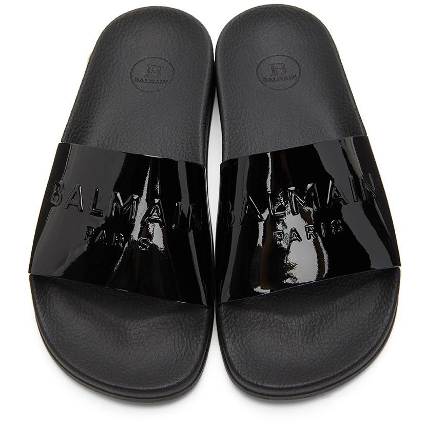 Patent leather slip-on sandals in black. Open round toe. Tonal text embossed at strap. Tonal logo embossed at grained molded rubber footbed. Tonal rubber sole featuring embossed logo at sides. Supplier color: Black Upper: leather, textile. Sole: rubber. Brand: Balmain