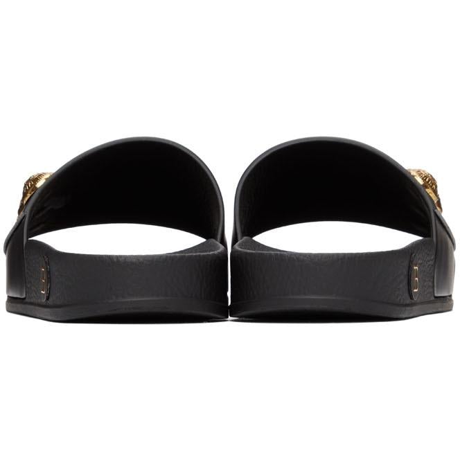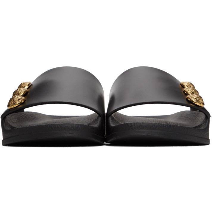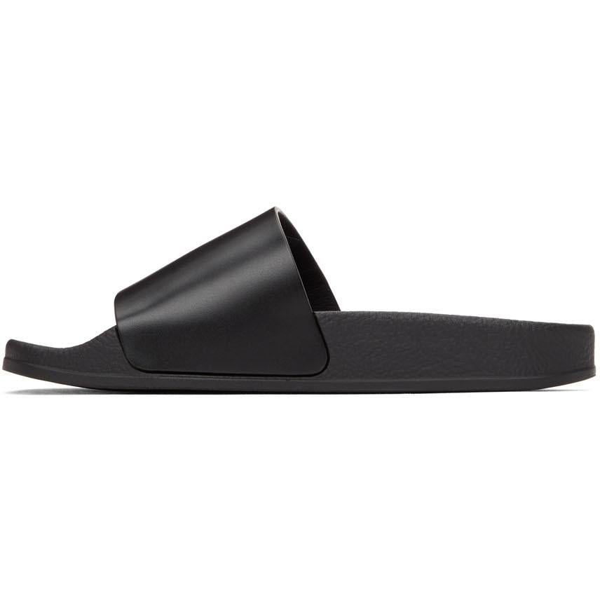 Buffed calfskin slip-on sandals in black. Logo engraved hardware at vamp. Logo embossed at tonal rubber footbed. Tonal treaded rubber outsole. Gold-tone hardware. Supplier color: Black Upper: calfskin. Sole: rubber. Brand: Balmain