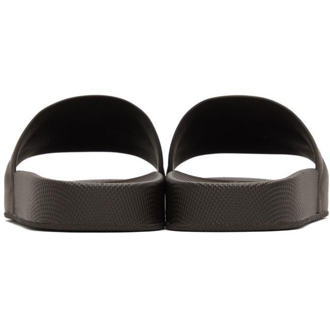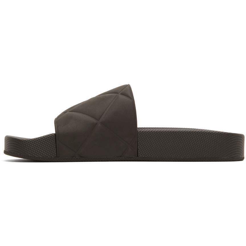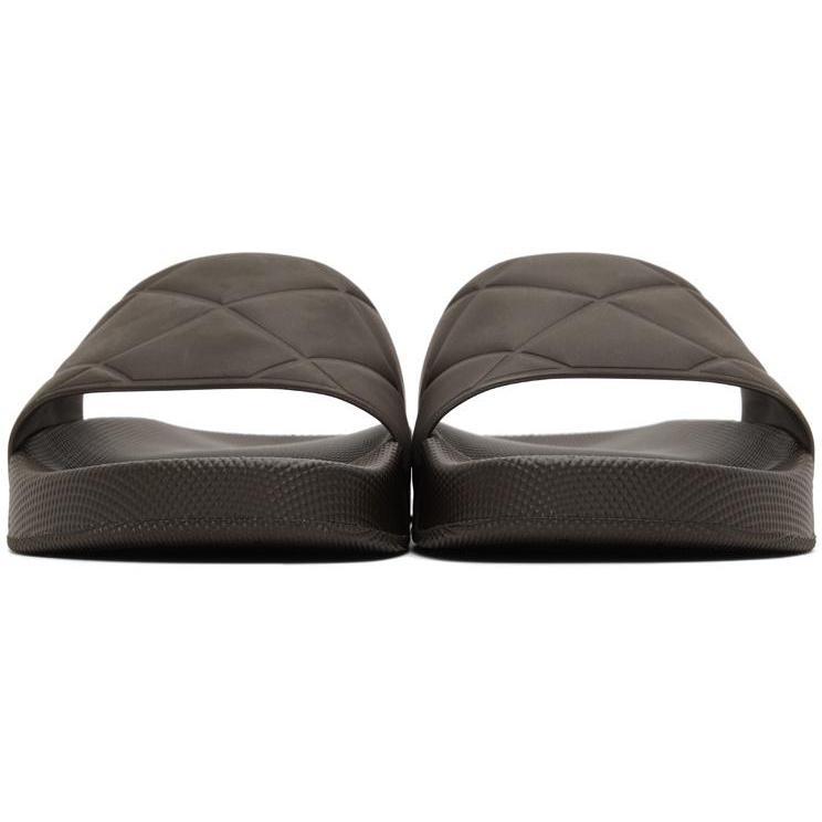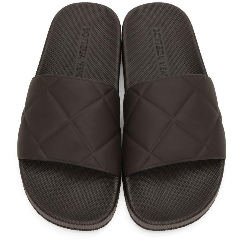 Rubber pool slides in brown. Embossed pattern at strap. Logo embossed at textured rubber footbed. Tonal treaded sole. Supplier color: Fondant Rubber. Brand: Bottega Veneta
