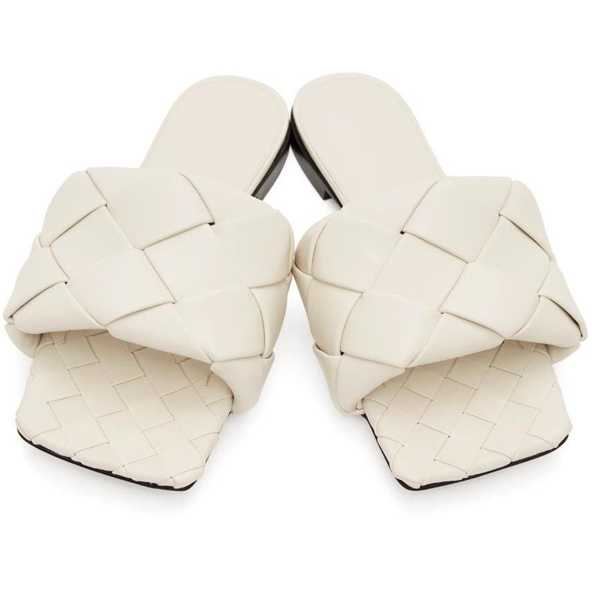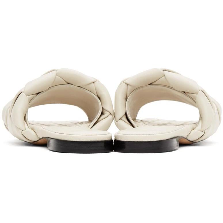 Intrecciato-woven nappa lambskin slip-on sandals in off-white. Open square toe. Logo embossed at tonal padded nappa footbed. Leather outsole in tan featuring rubber injection. Supplier color: Wax Lambskin. Brand: Bottega Veneta