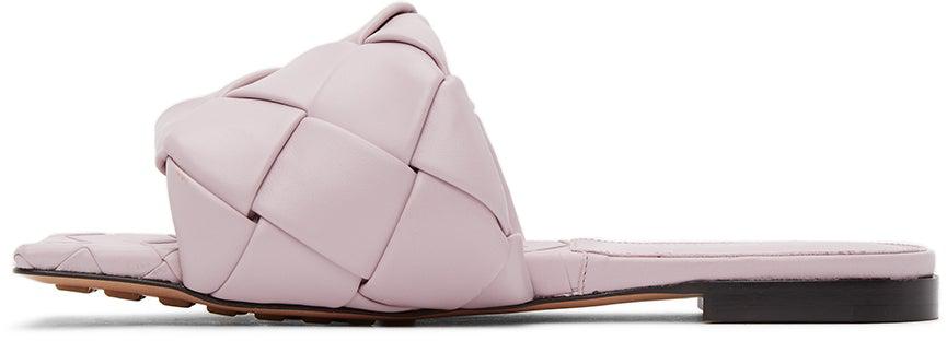 Intrecciato-woven nappa lambskin slip-on sandals in pink. Open square toe. Logo embossed at tonal nappa lambskin footbed. Intrecciato-woven nappa lambskin lining. Leather outsole in tan featuring pebbled rubber injection. Supplier color: Magnolia Upper: lambskin. Sole: leather, rubber. Brand: Bottega Veneta