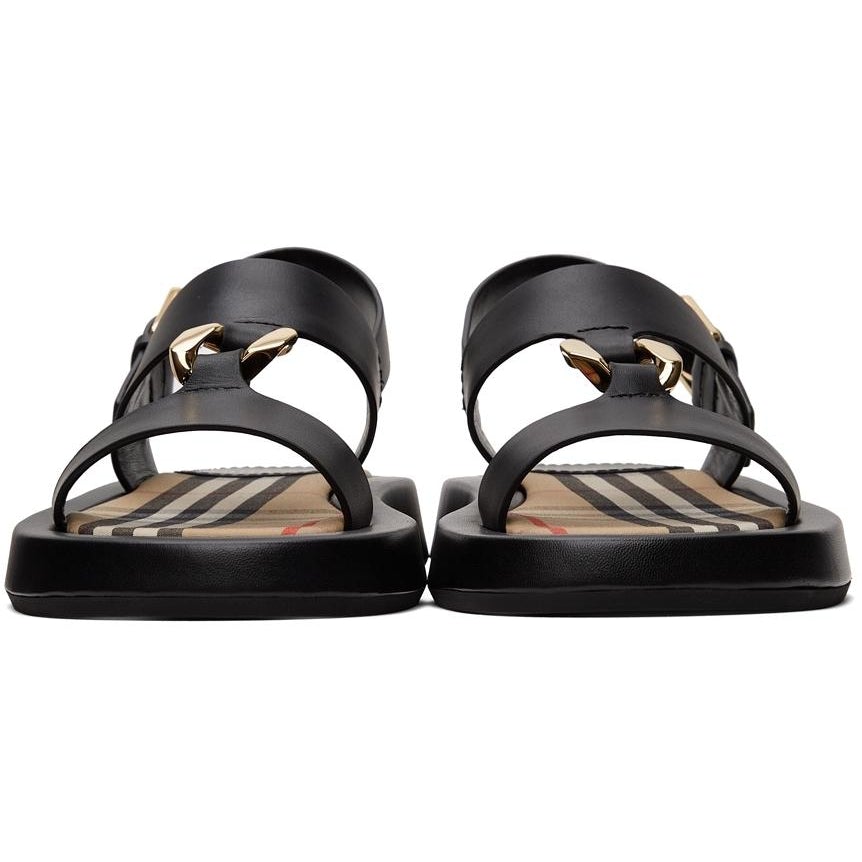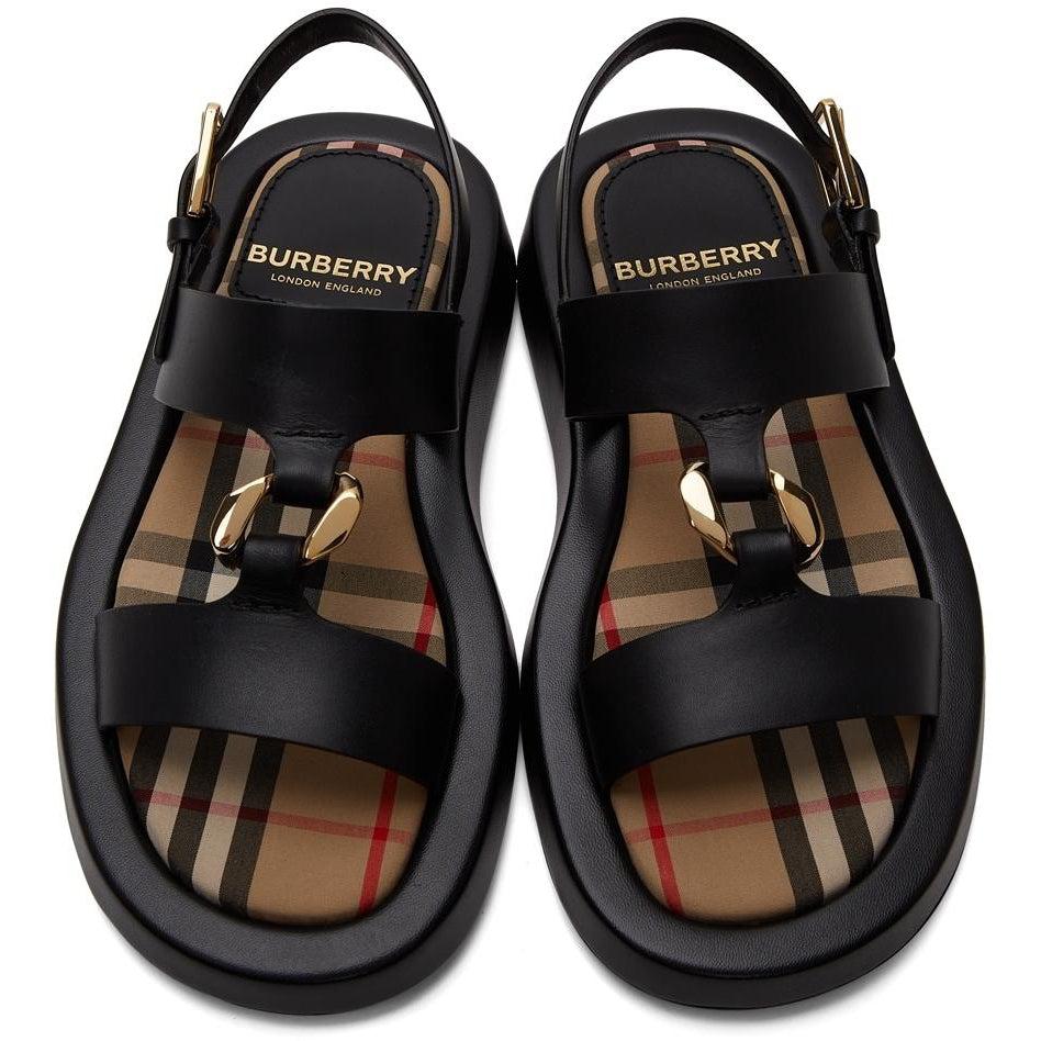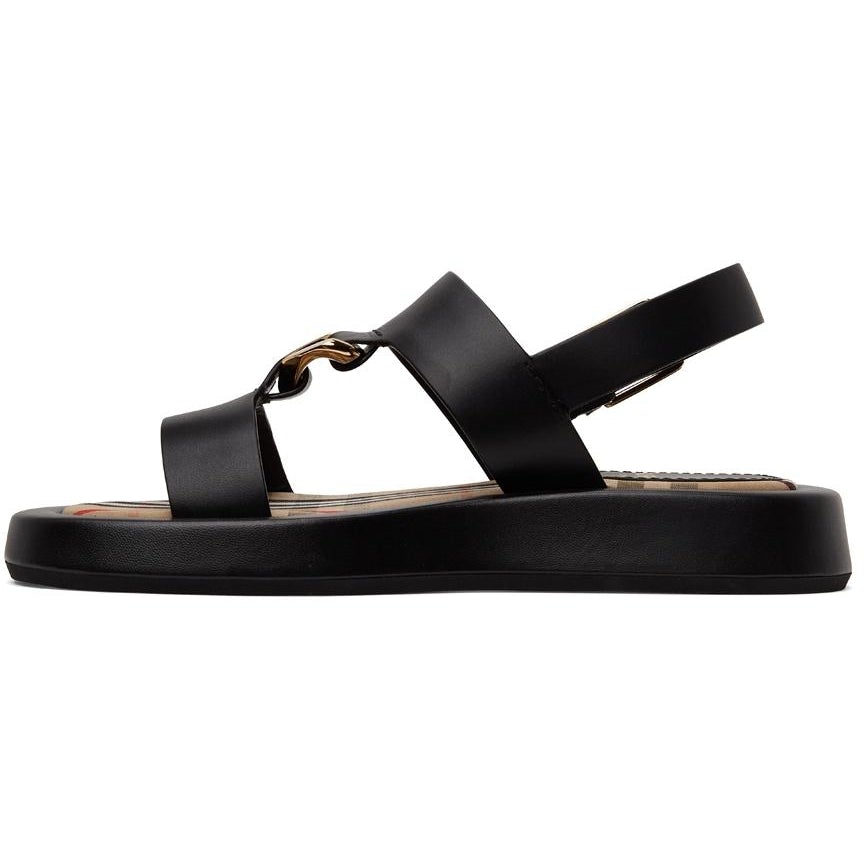 Buffed leather sandals in black. Open round toe. Buffed leather straps at vamp and heel featuring pin-buckle fastening. Woven footbed featuring signature check pattern in brown, black, and red and leather logo patch. Buffed leather midsole. Rubber outsole. Gold-tone hardware. Supplier color: Archive beige Upper: leather, textile. Sole: leather, rubber. Brand: Burberry
