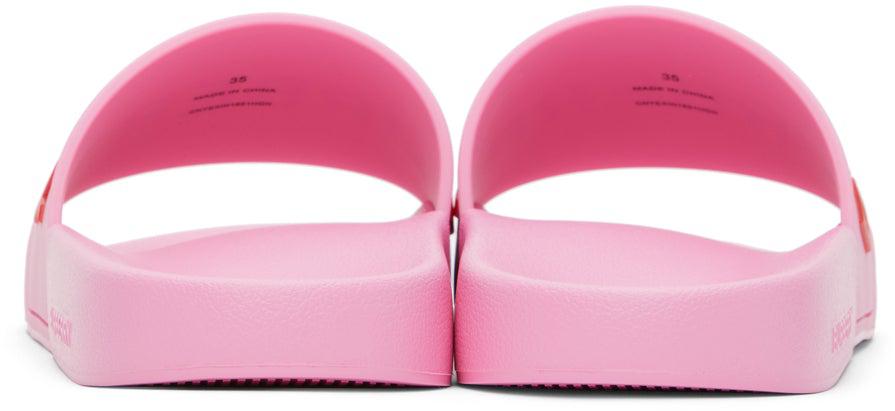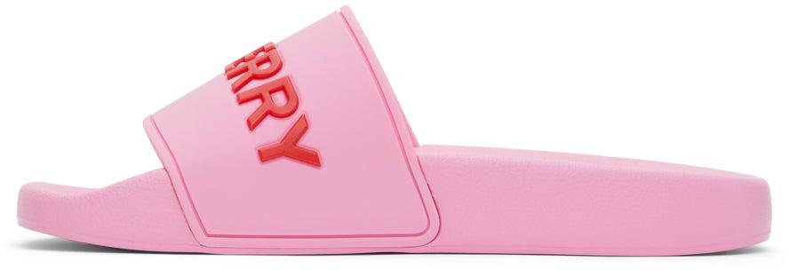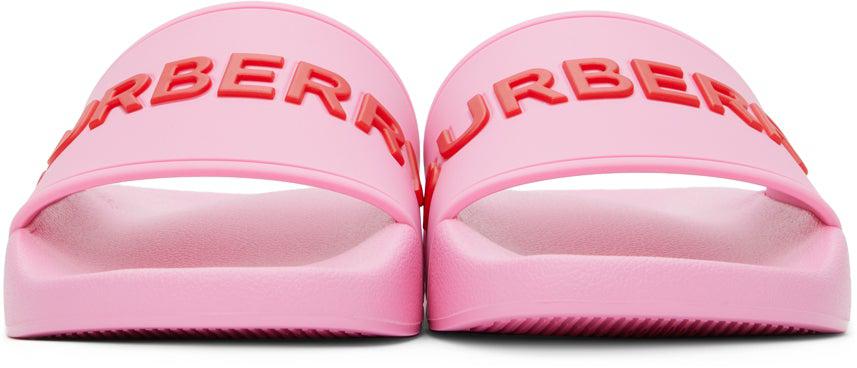 Rubber slip-on sandals in pink. Open round toe. Rubberized logo in red at vamp. Tonal molded rubber footbed. Tonal textured rubber midsole feature embossed logo at outer side. Tonal treaded rubber outsole. Supplier color: Bubble gum pink Upper: thermoplastic polyurethane. Sole: rubber. Brand: Burberry