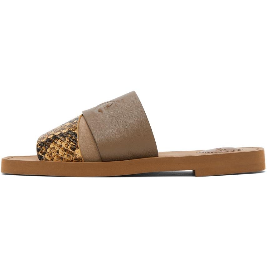 Paneled snake-embossed calfskin, suede, and buffed sheepskin slip-on sandals in tones of khaki, brown, yellow, and black. Open square toe. Logo embossed at vamp. Buffed leather logo patch in tan at footbed. Foam rubber sole in brown. Supplier color: Wild khaki Upper: calfskin, sheepskin. Sole: rubber. Brand: Chloé