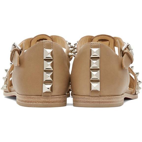 Buffed leather flat sandals in tan. Round toe. Straps at vamp featuring signature studs. Adjustable ankle strap with pin-buckle fastening. Pyramid studs at heel tab. Signature red leather sole. Silver-tone hardware. Supplier color: Fennec Upper: leather. Sole: leather. Brand: Christian Louboutin