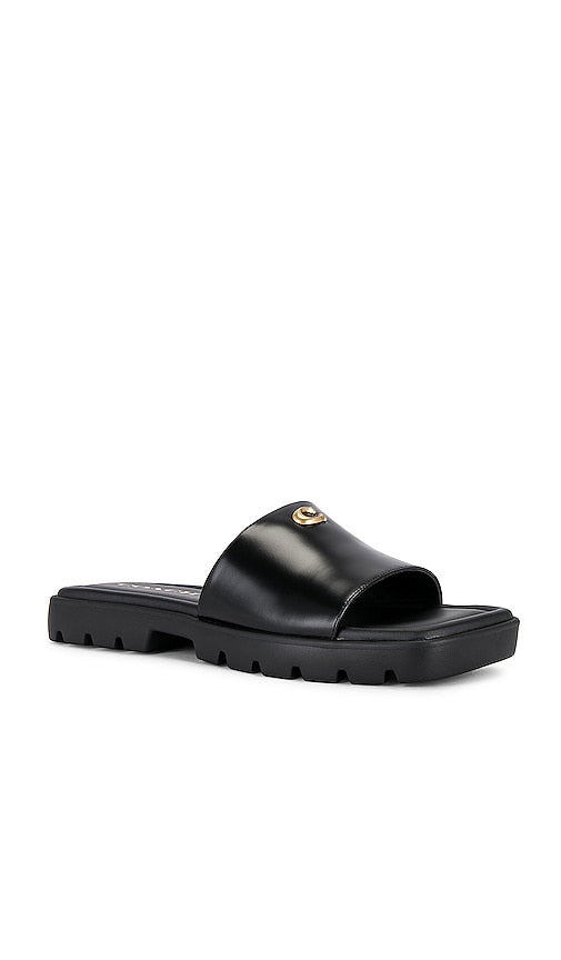 Patent leather upper with manmade sole. Made in Vietnam. Slip-on styling. Faux leather footbed and lining. Gold-tone C hardware at vamp. Slanted square toe. COAH-WZ180. CP899BLK. Coach is a leading design house of modern luxury accessories and lifestyle collections, with a long-standing reputation built on quality craftsmanship. Defined by a free-spirited, all-American attitude, the brand approaches design with a modern vision, reimagining luxury for today with an authenticity and innovation that is uniquely Coach. All over the world, the Coach name is synonymous with effortless New York style. Color: Black. Shop Black Flat Sandals for women and the latest Coach shoes now.