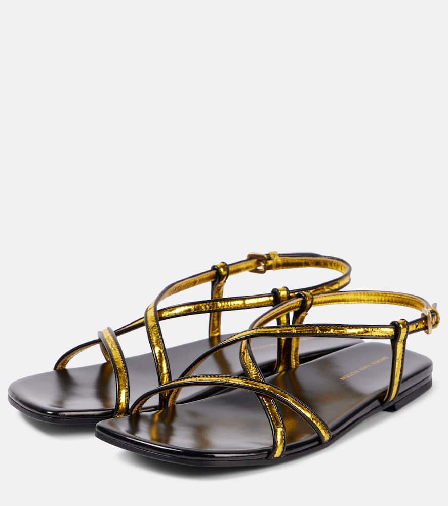 Upper: leather. Lining: leather. Sole: leather insole and sole. Toe shape: square open toe. Made in Italy. Includes: shoe box, dust bag. Designer color name: Gold. Closure: buckle-fastening ankle strap. Shop the latest Dries Van Noten Flat Sandals for women now.