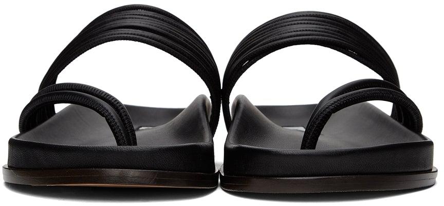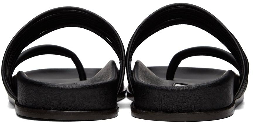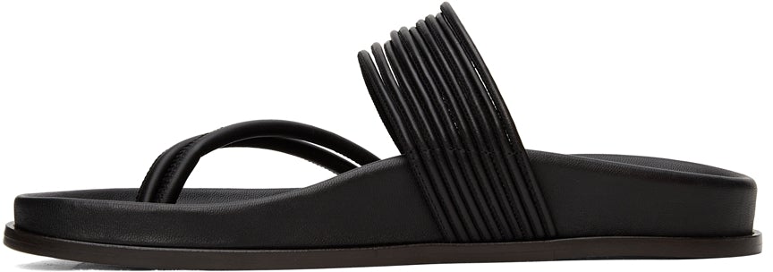 Nappa leather sandals in black. Open round toe. Padded nappa leather straps at vamp. Textile logo in white at molded leather footbed. Leather sole in black and tan with rubber injection at heel. Supplier color: Black Upper: leather. Sole: leather, rubber. Brand: Emme Parsons