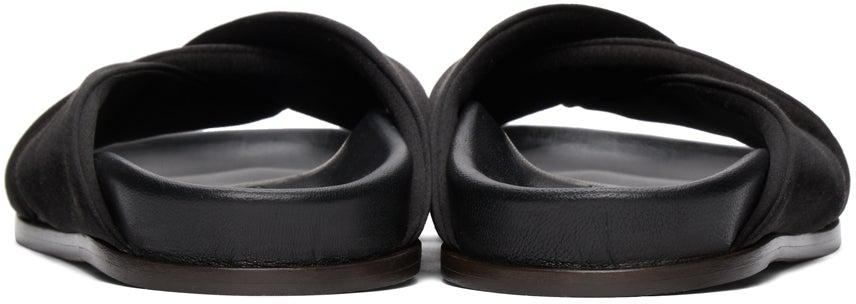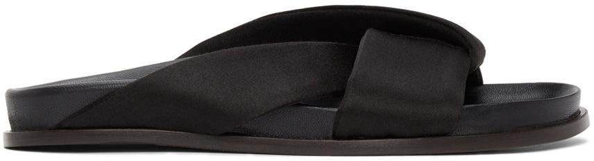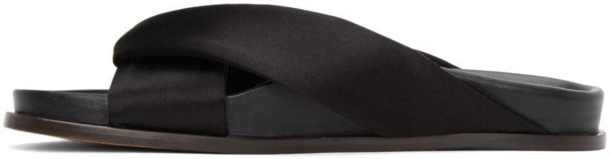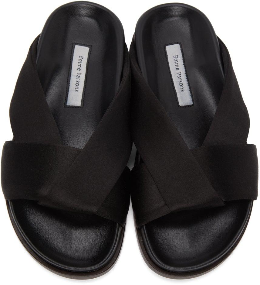 Satin slip-on sandals in black. Open round toe. Padded criss-crossing straps at vamp. Textile logo patch at tonal molded leather footbed. Tonal and tan leather sole. Supplier color: Black Upper: textile, leather. Sole: leather. Brand: Emme Parsons
